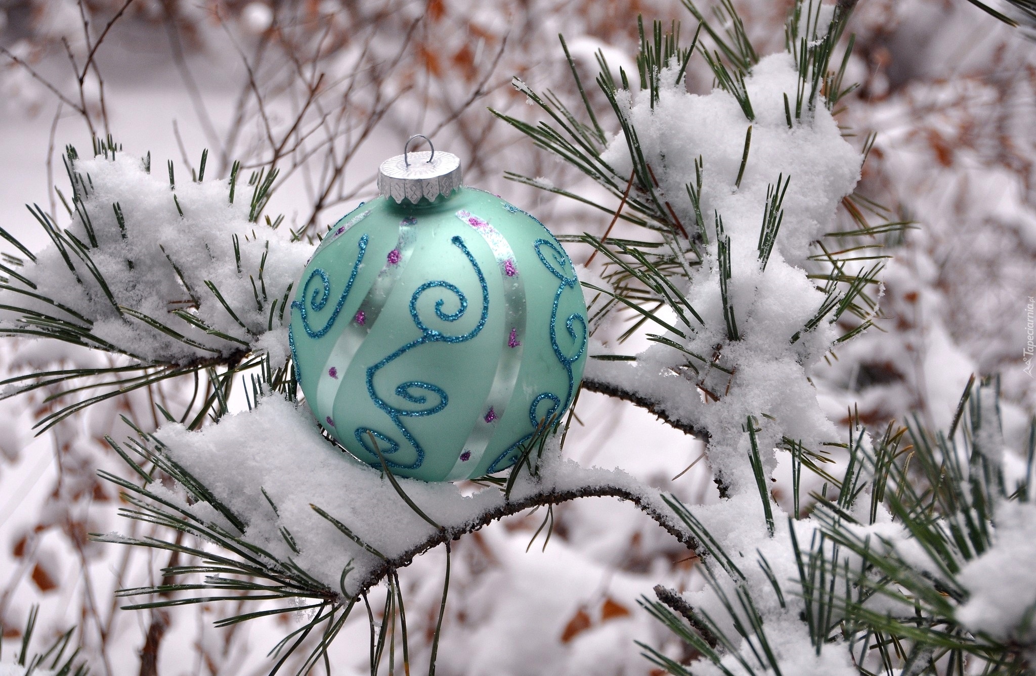 Edytor tapety: Bombka na gałązce w śniegu