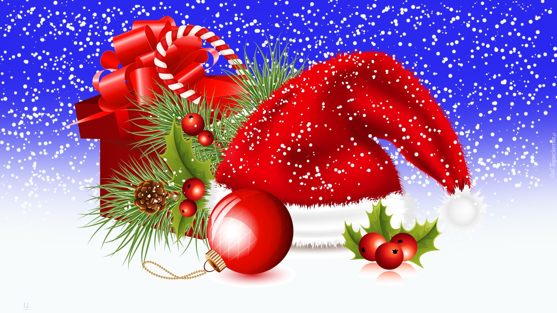 Edytor tapety: Czapka Mikołaja i prezent na śniegu