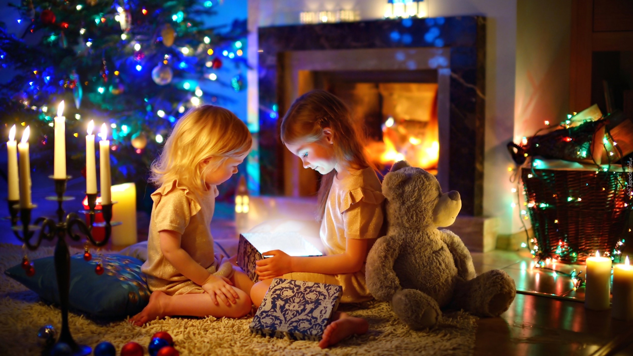 Edytor tapety: Dzieci z prezentami na dywanie przy kominku