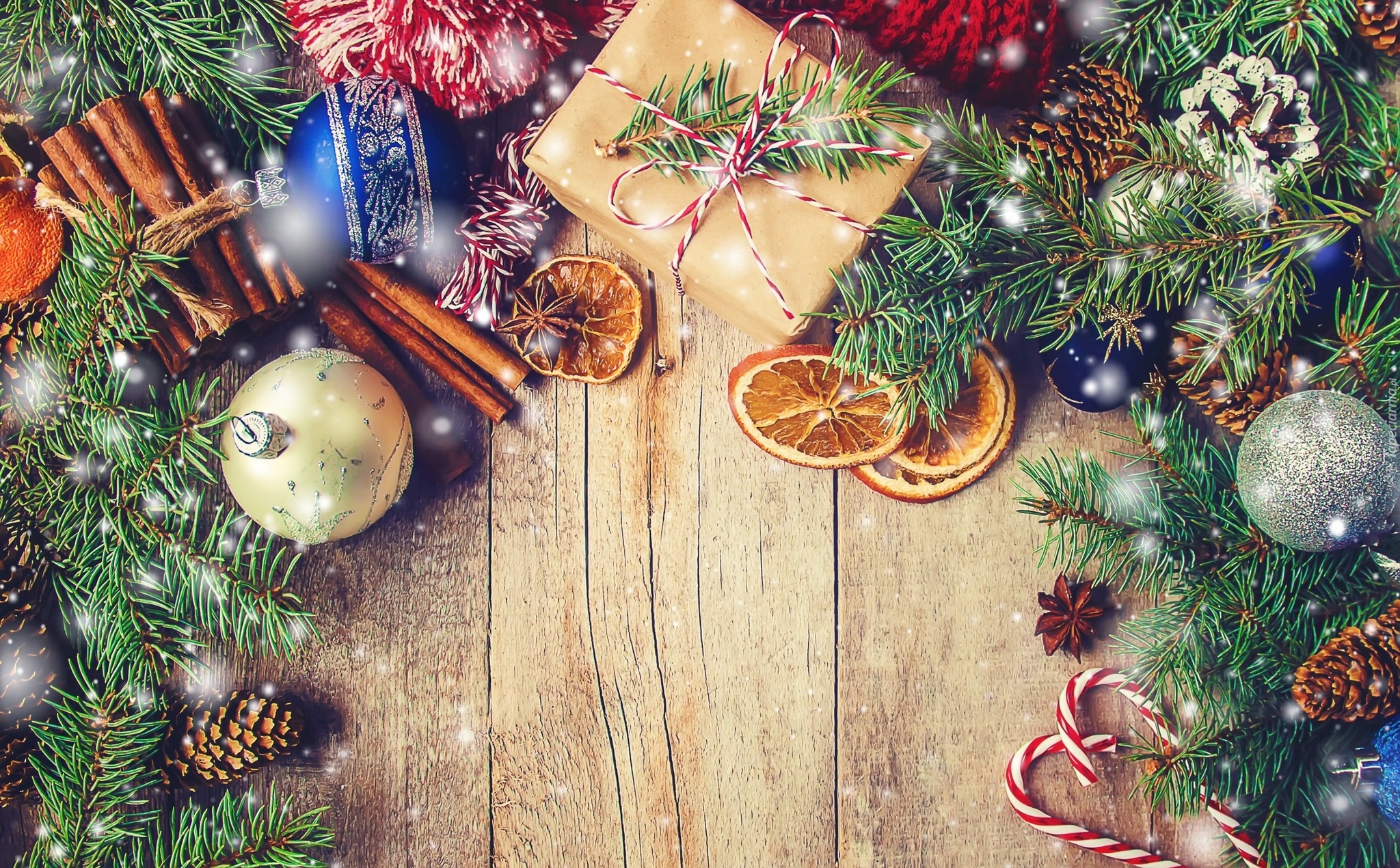 Edytor tapety: Ozdoby świąteczne i prezent pośród gałązek świerku