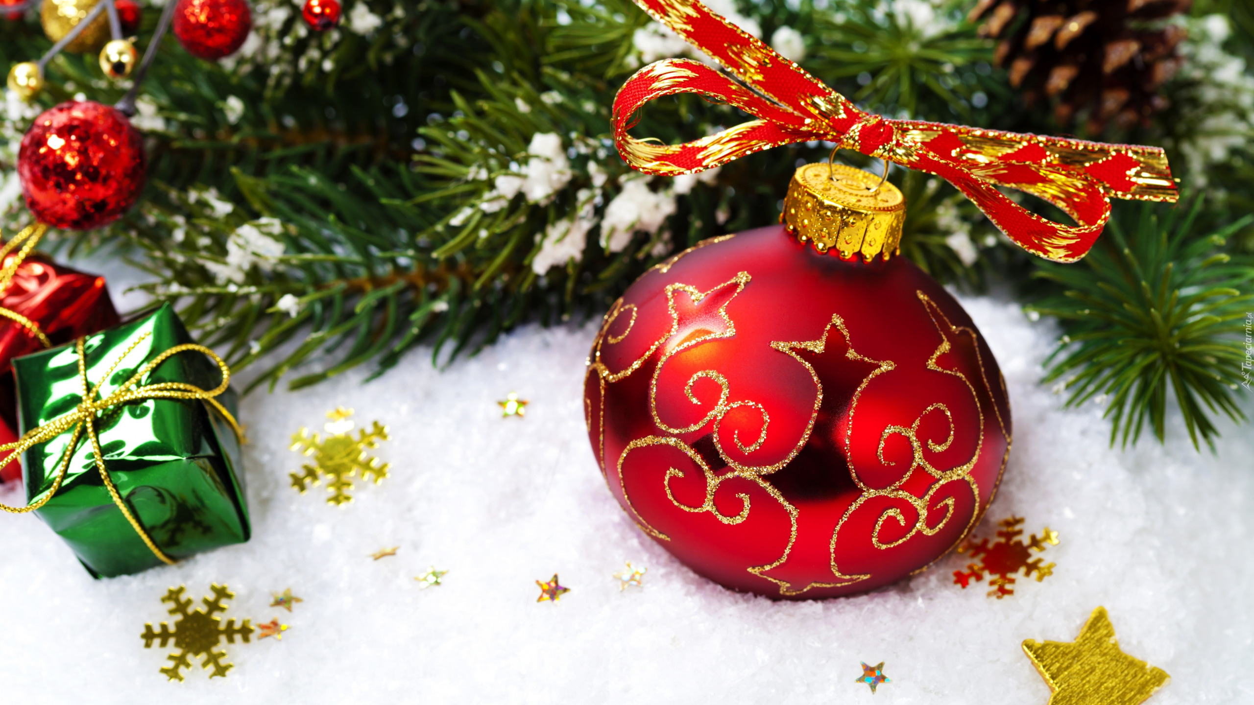 Edytor tapety: Bombka z kokardką na śniegu