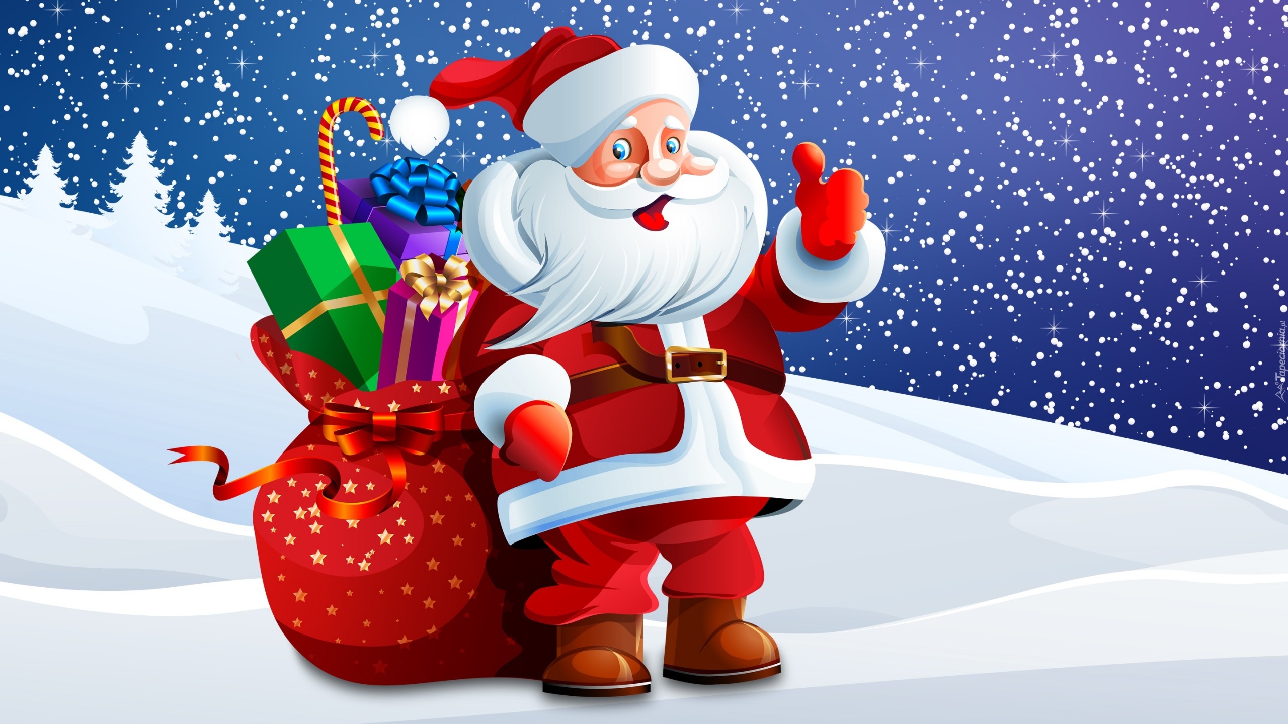 Edytor tapety: Mikołaj z workiem prezentów na śniegu
