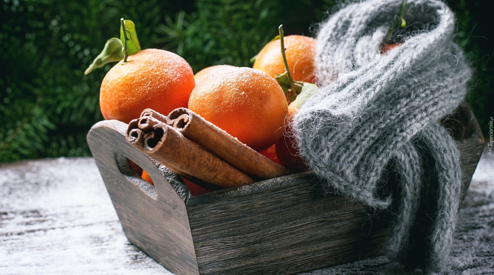 Edytor tapety: Mandarynki i laski cynamonu w skrzynce