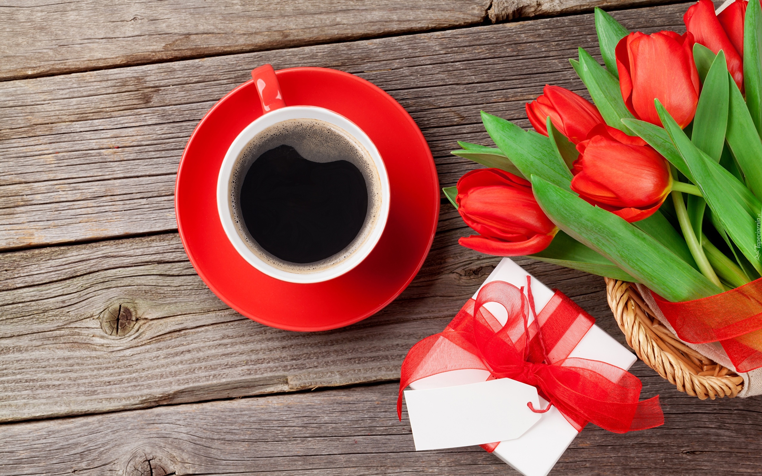 Edytor tapety: Kawa w filiżance obok prezentu i bukietu tulipanów
