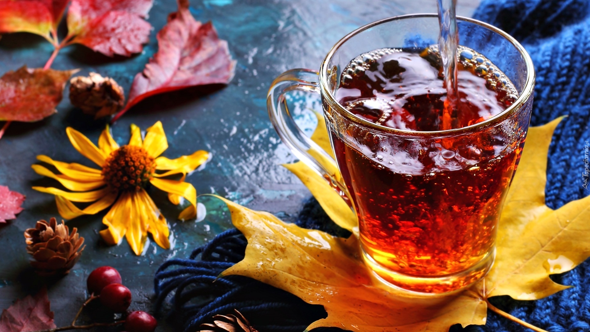 Edytor tapety: Szklanka herbaty na liściu klonu