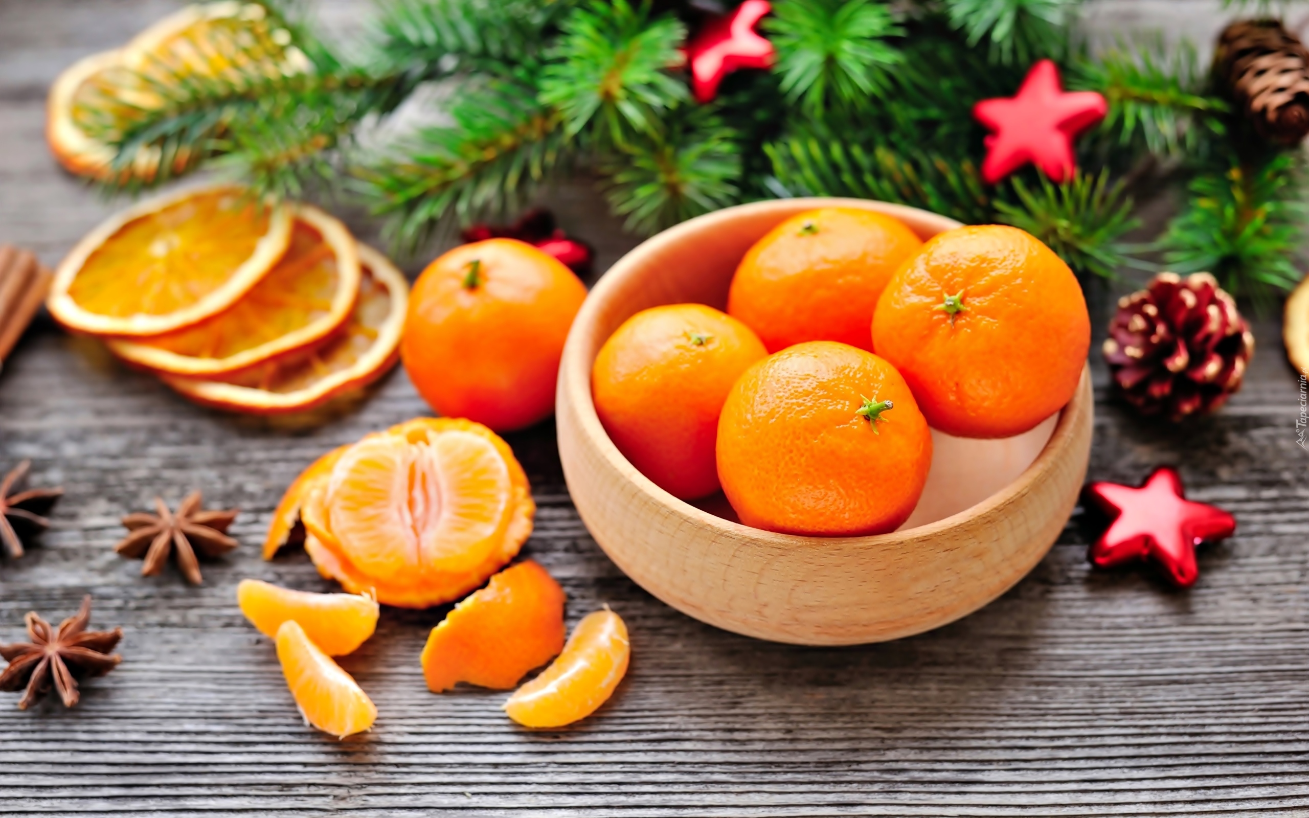 Edytor tapety: Mandarynki w miseczce przy gałązkach świerku
