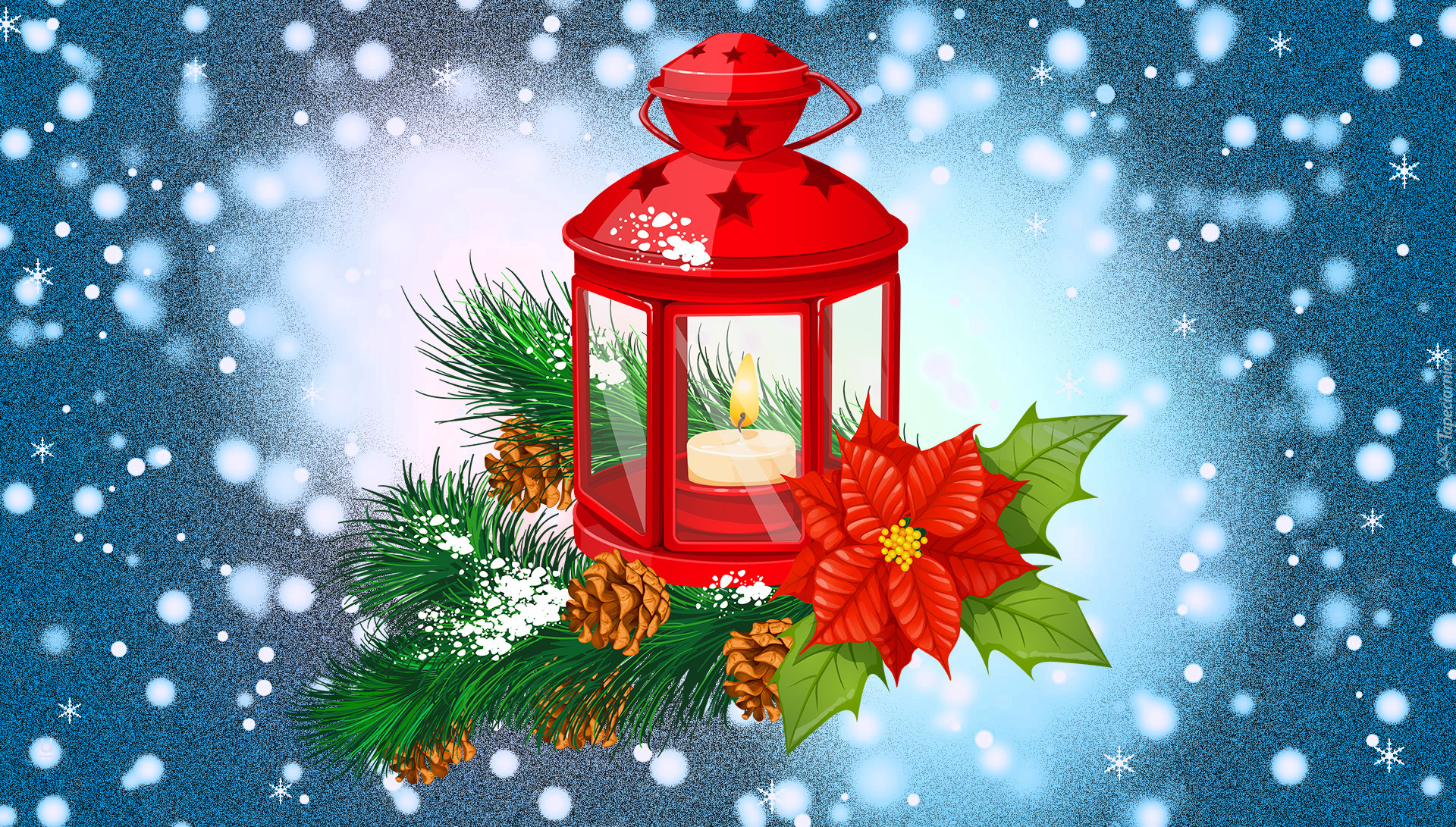 Edytor tapety: Graficzny lampion z gwiazdą betlejemską, szyszkami i gałązkami