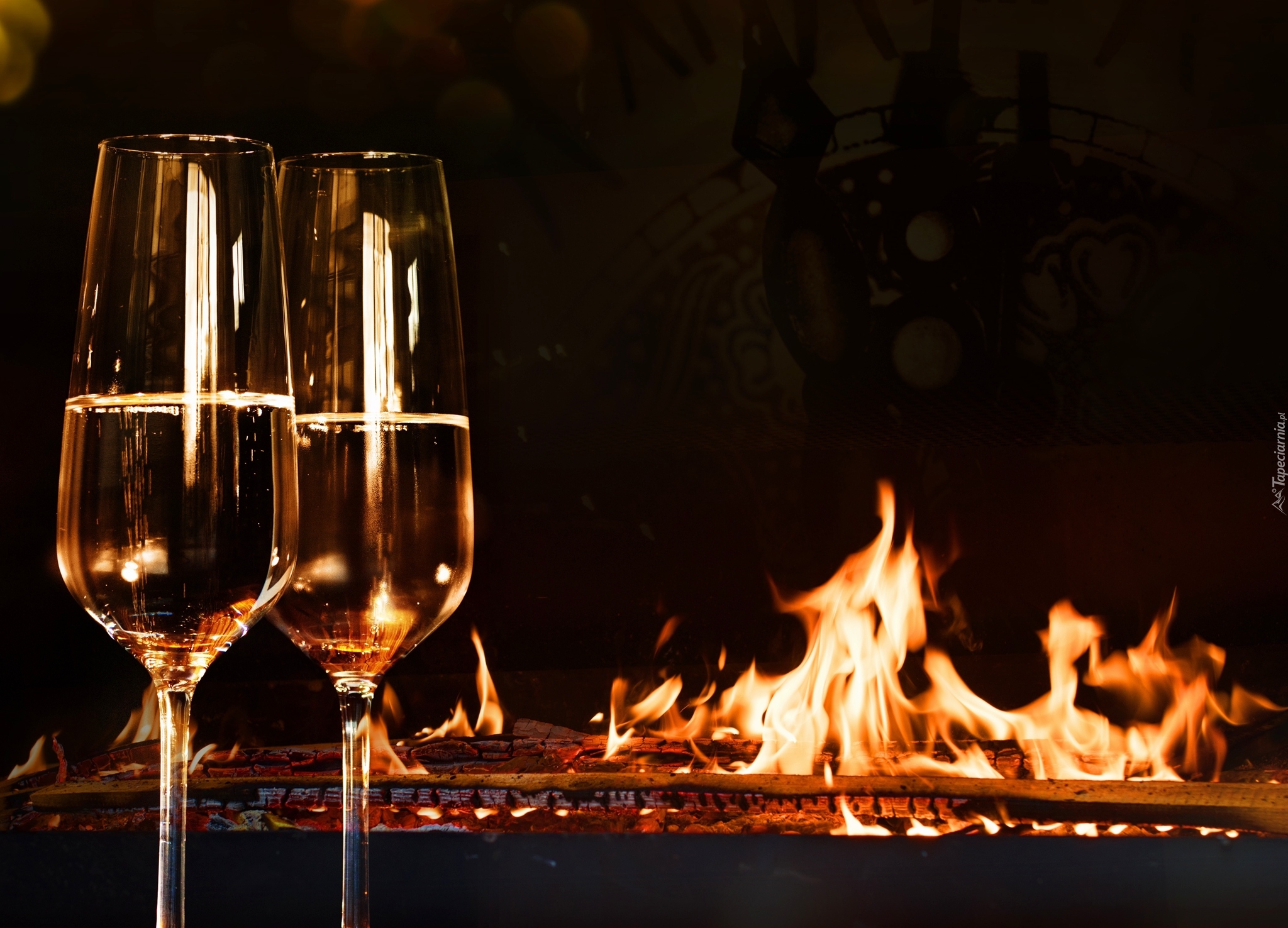 Edytor tapety: Dwa kieliszki szampana na tle ognia