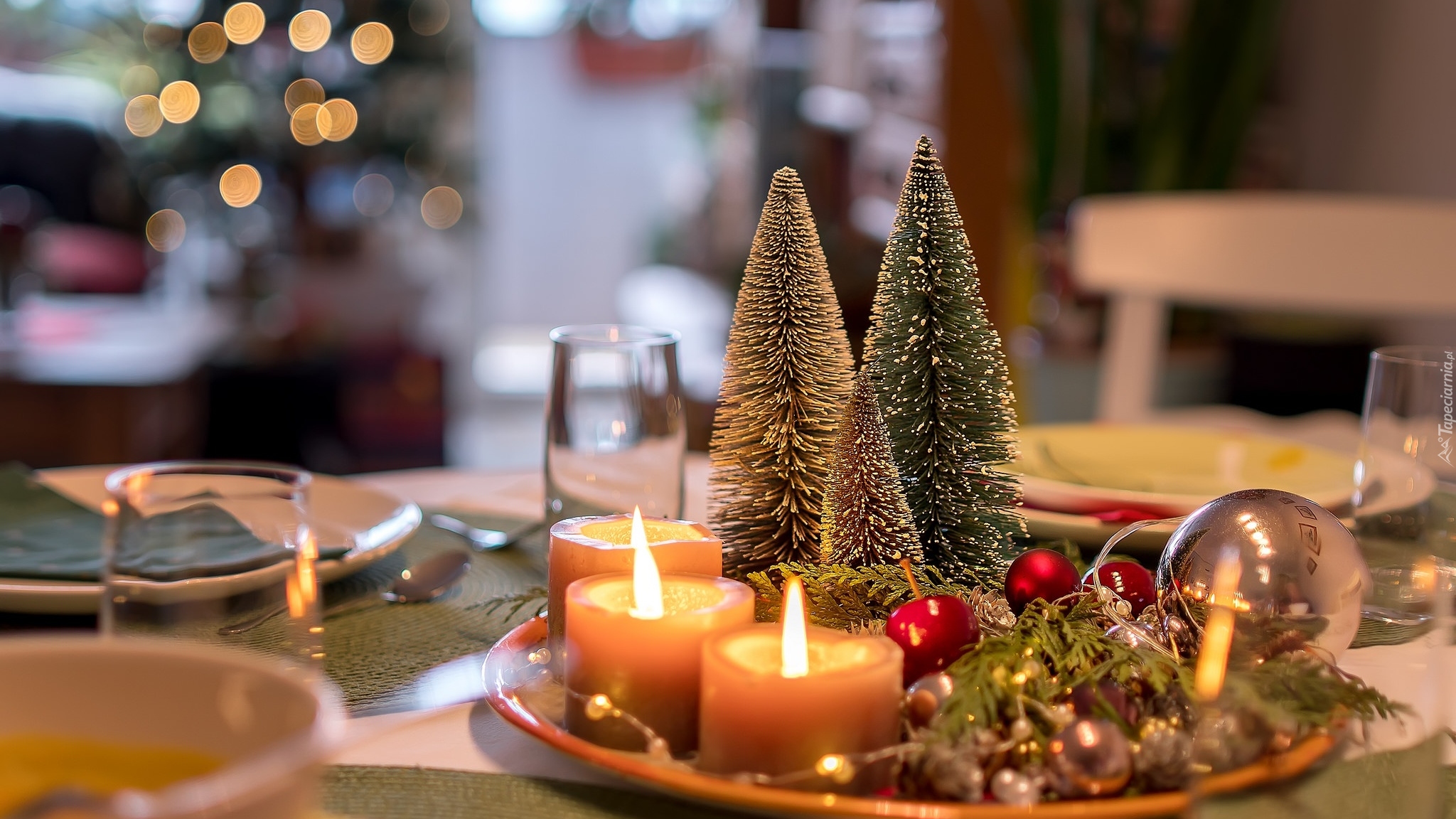 Edytor tapety: Miniaturowe choinki i świece w świątecznym stroiku