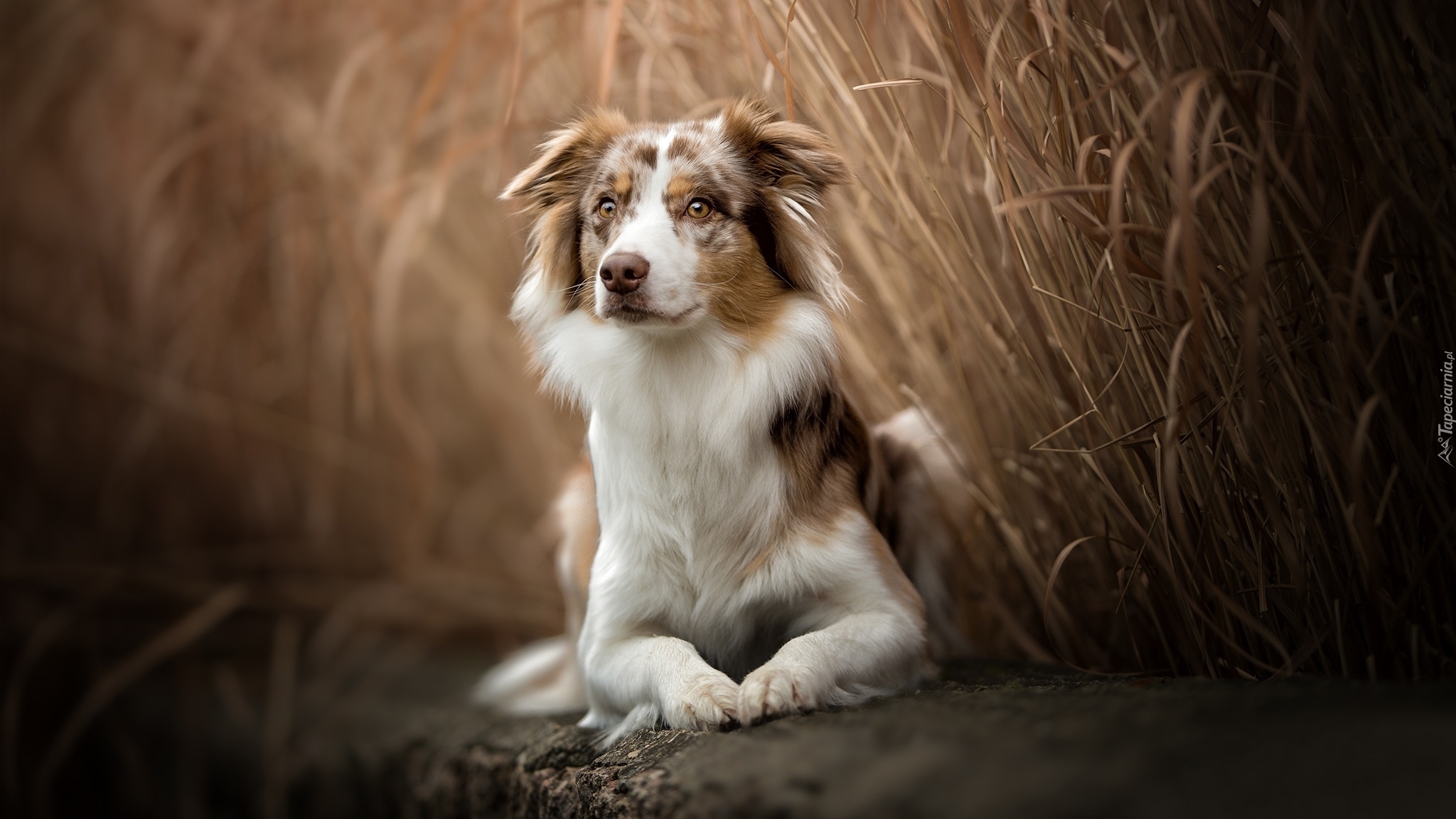 Edytor tapety: Owczarek australijski leży w uschniętej trawie