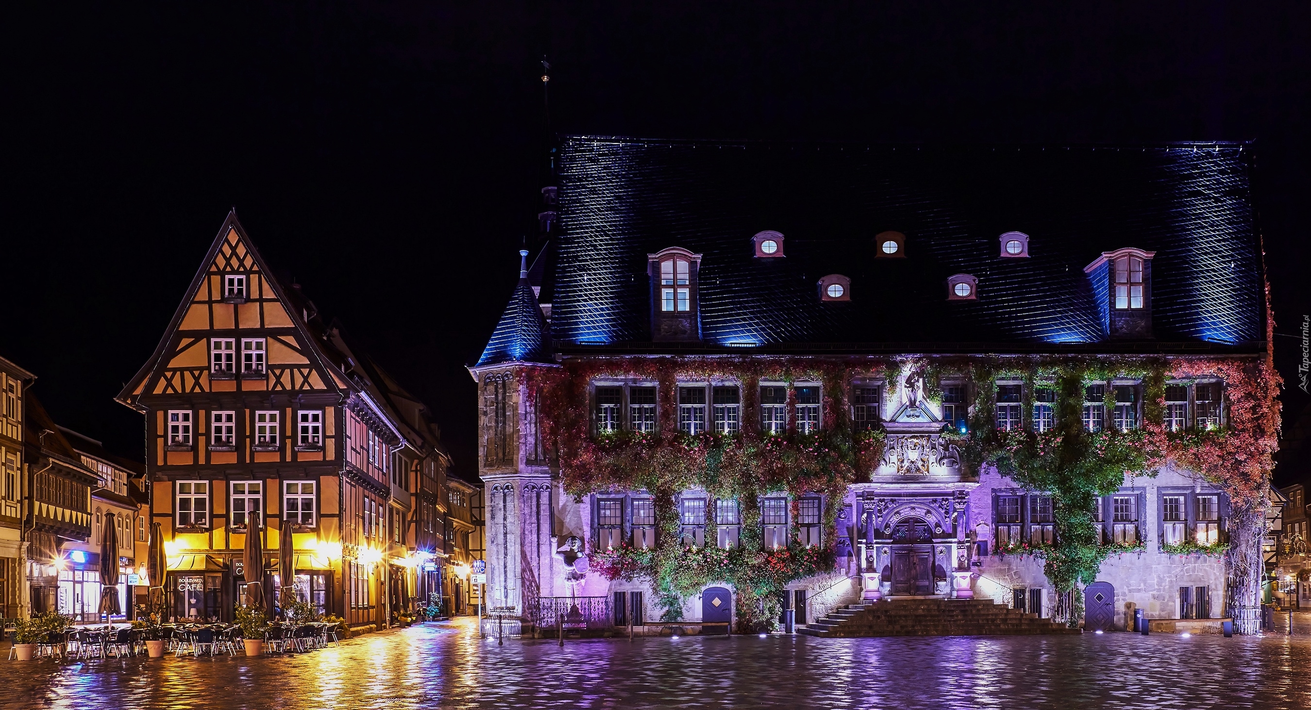 Edytor tapety: Oświetlony rynek w niemieckim mieście Quedlinburg