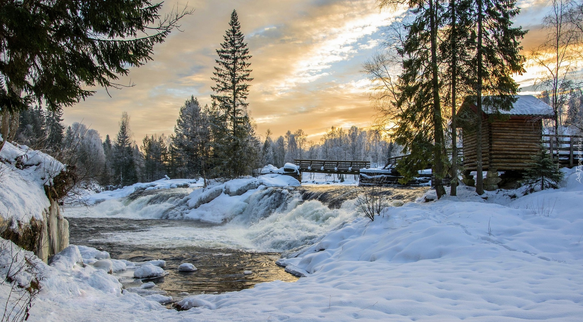 Edytor tapety: Wschód słońca nad zimową rzeką, mostkiem i drzewami