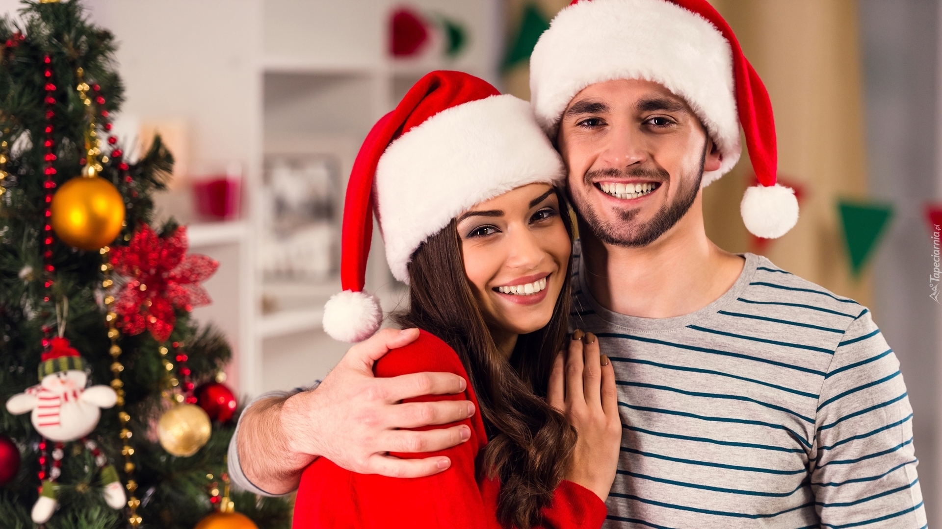 Edytor tapety: Uśmiechnięta para w mikołajkowych czapkach