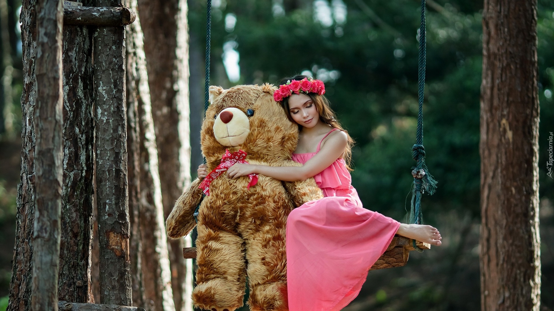 Edytor tapety: Kobieta tuląca pluszowego misia na huśtawce