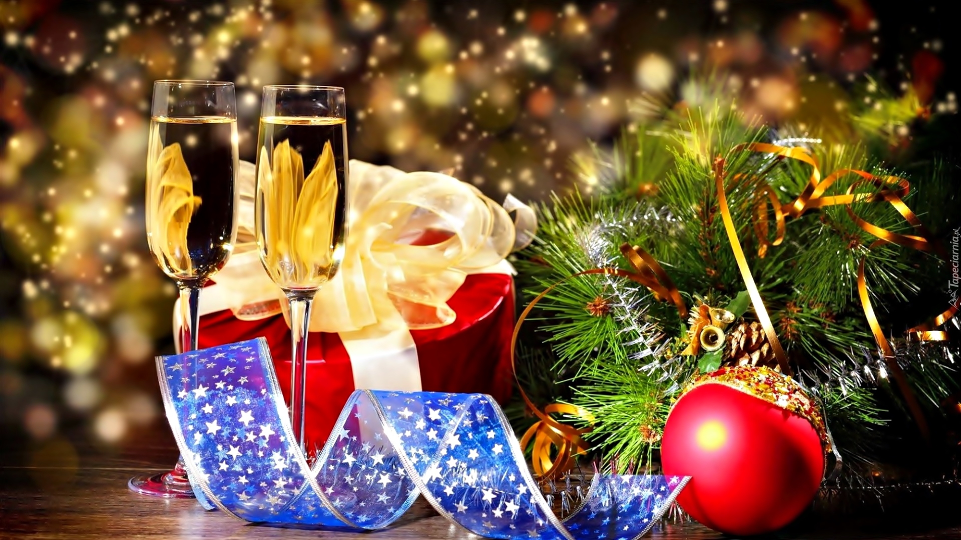 Edytor tapety: Kieliszki z szampanem obok dekoracji sylwestrowej