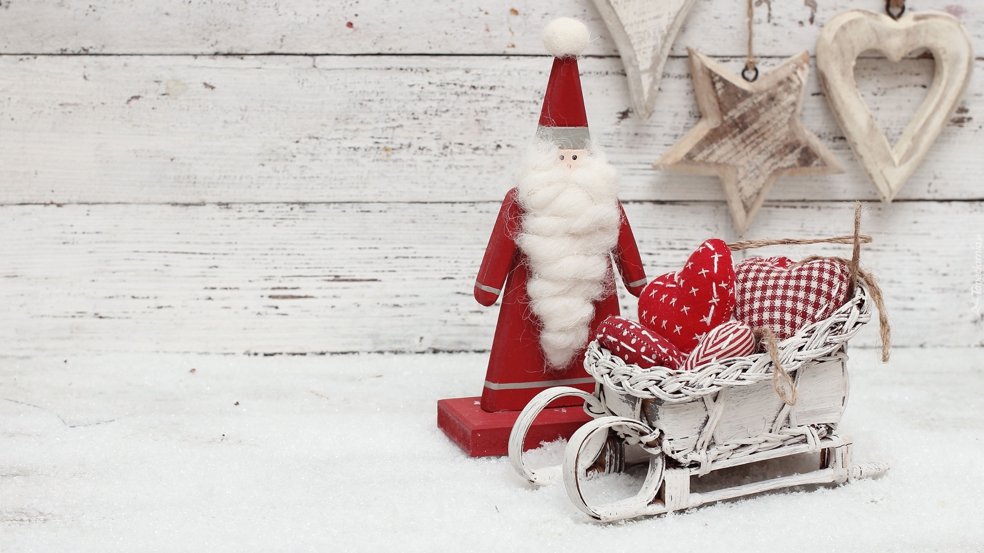 Edytor tapety: Mikołaj z długą brodą obok sanek z sercami