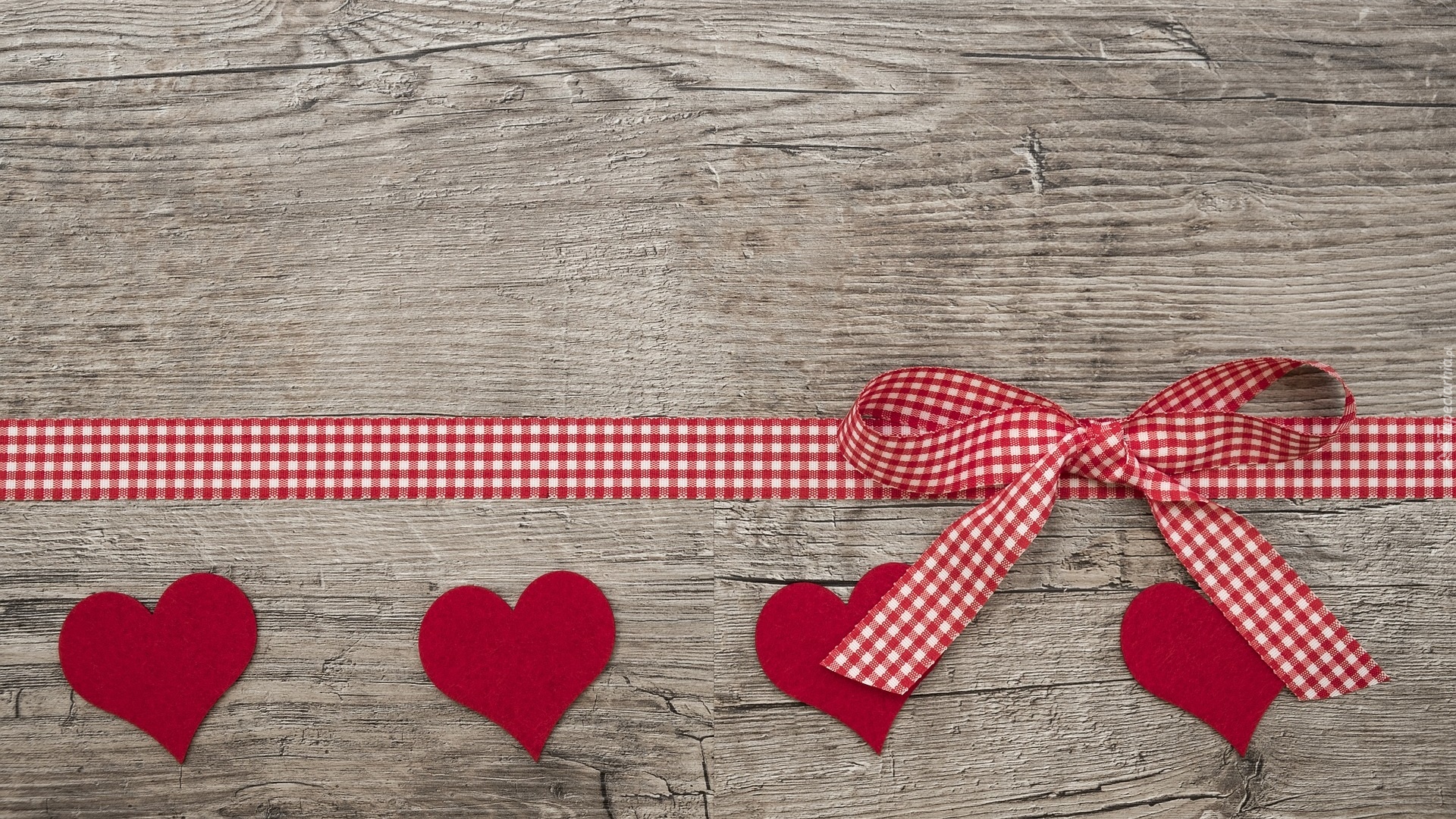 Edytor tapety: Czerwone serduszka i kokarda na deskach