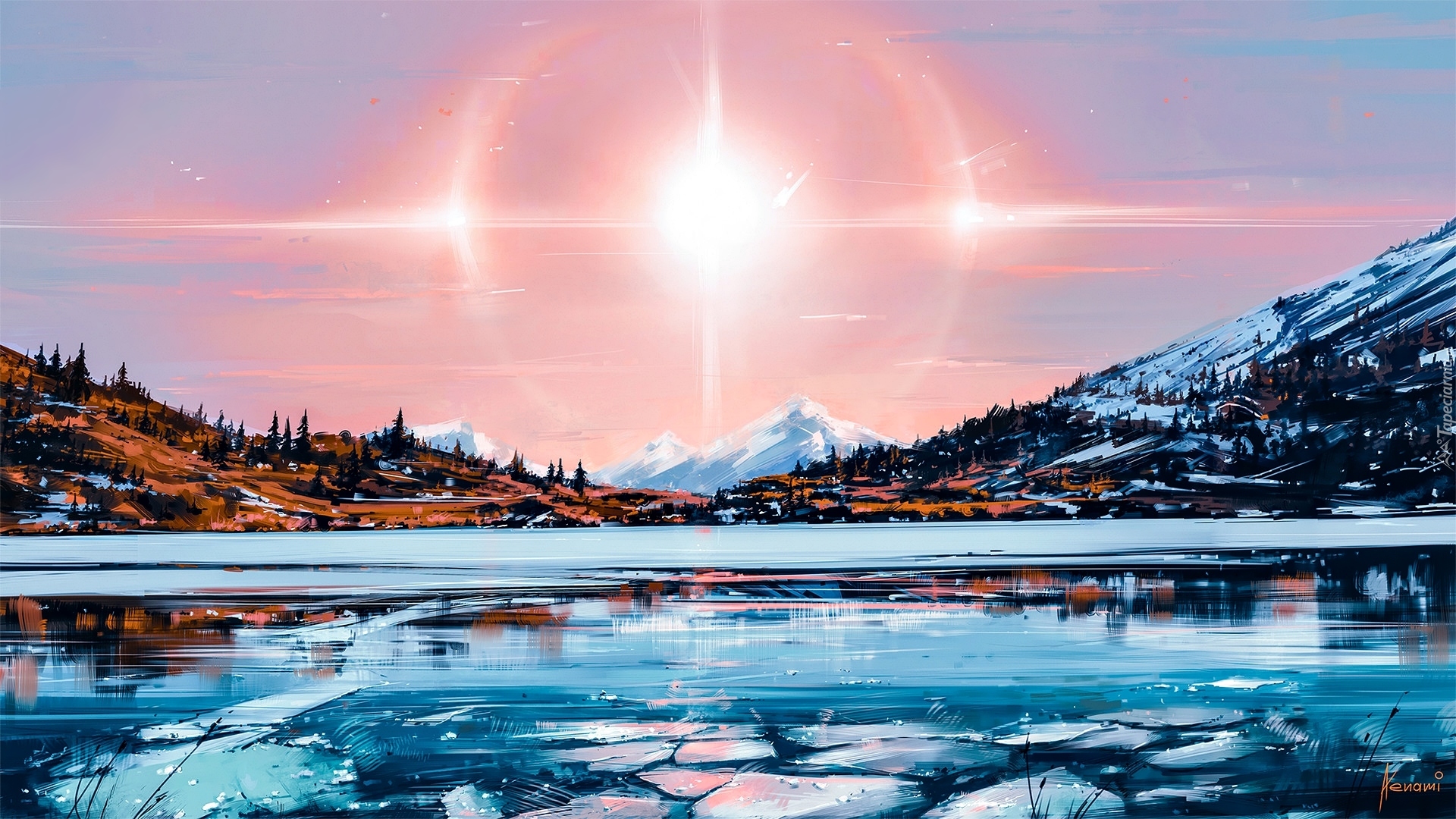 Edytor tapety: Wschód słońca nad jeziorem w górach