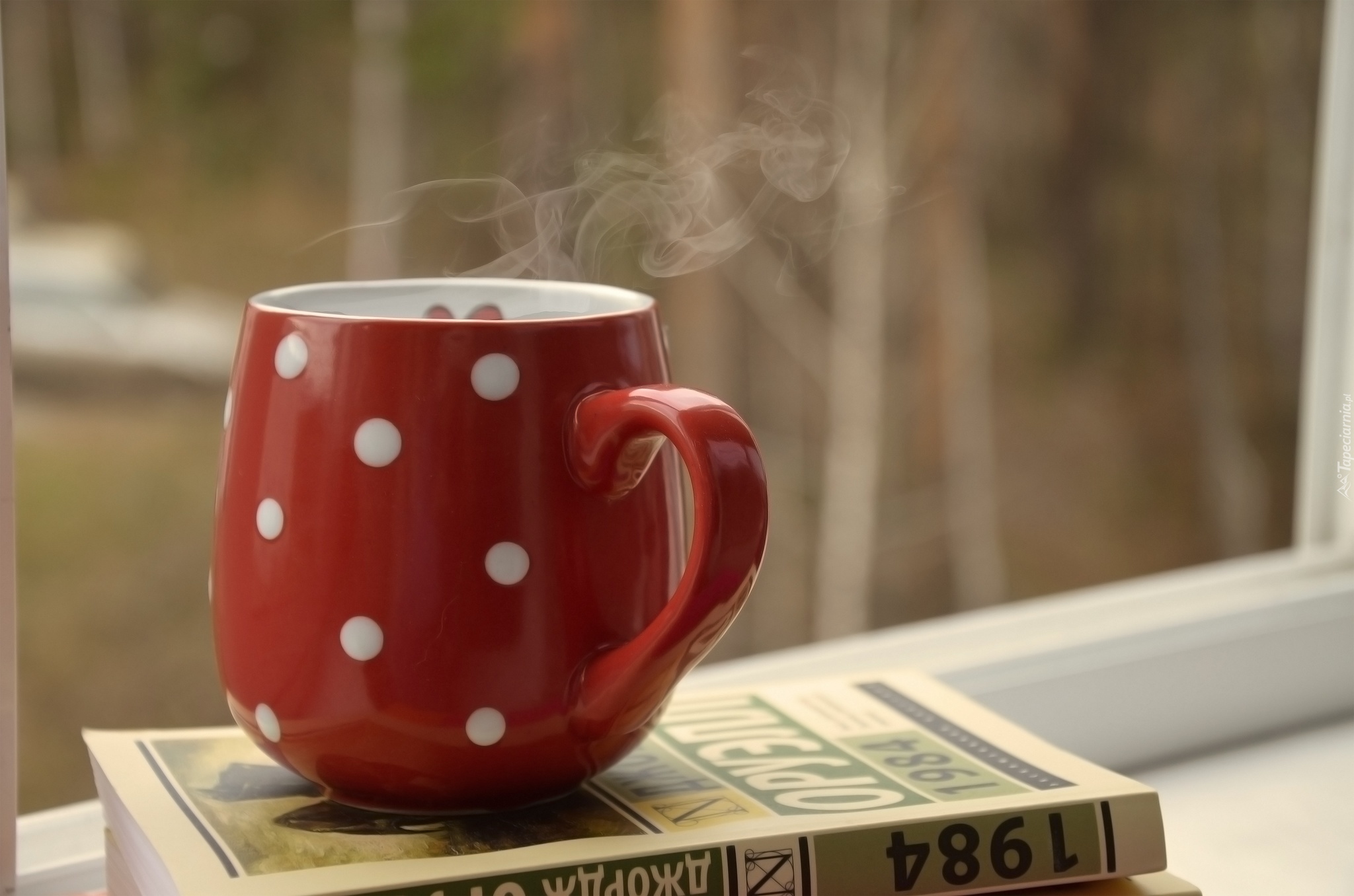 Edytor tapety: Para wydobywająca się z kubka postawionego na książce
