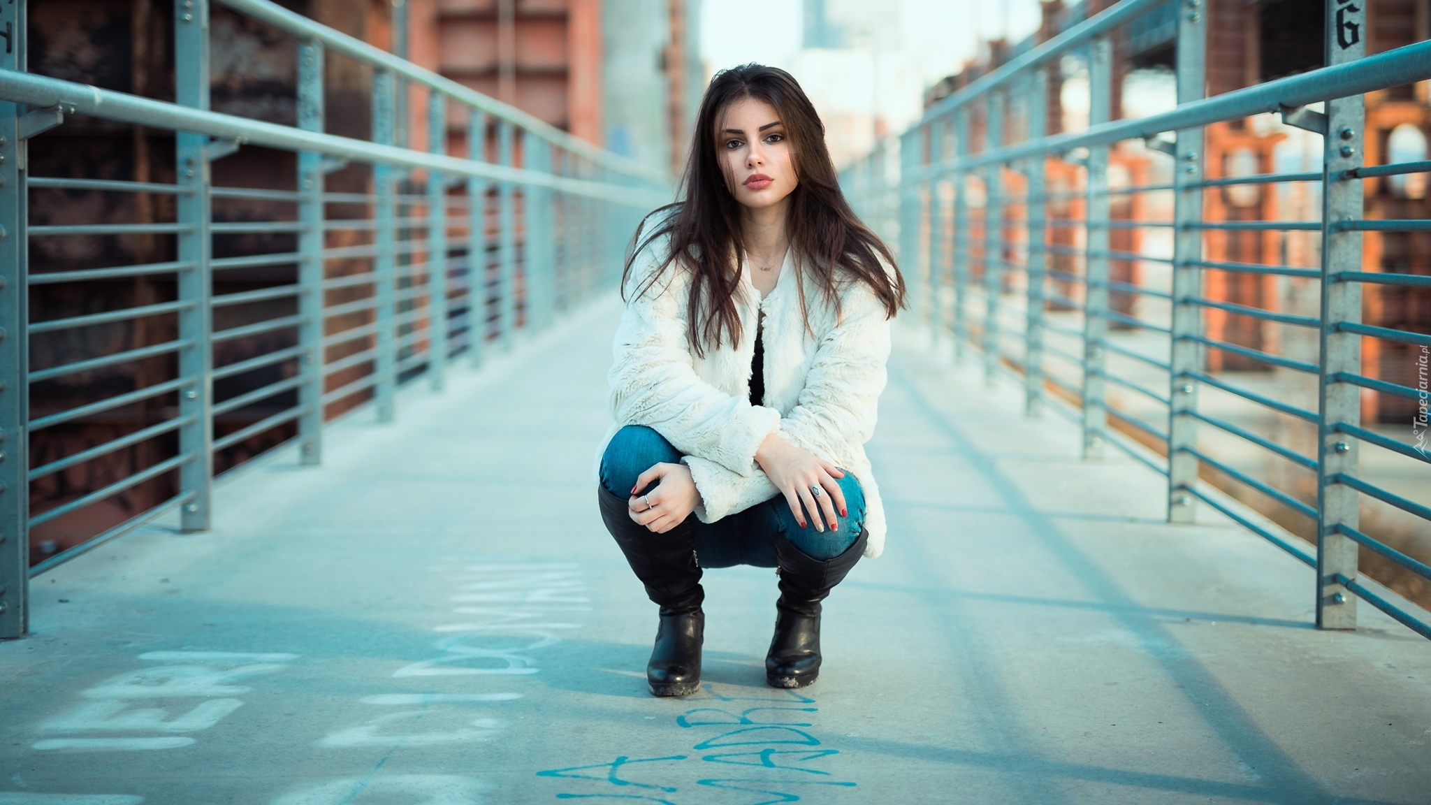 Edytor tapety: Dziewczyna z długimi włosami przykucnęła na moście