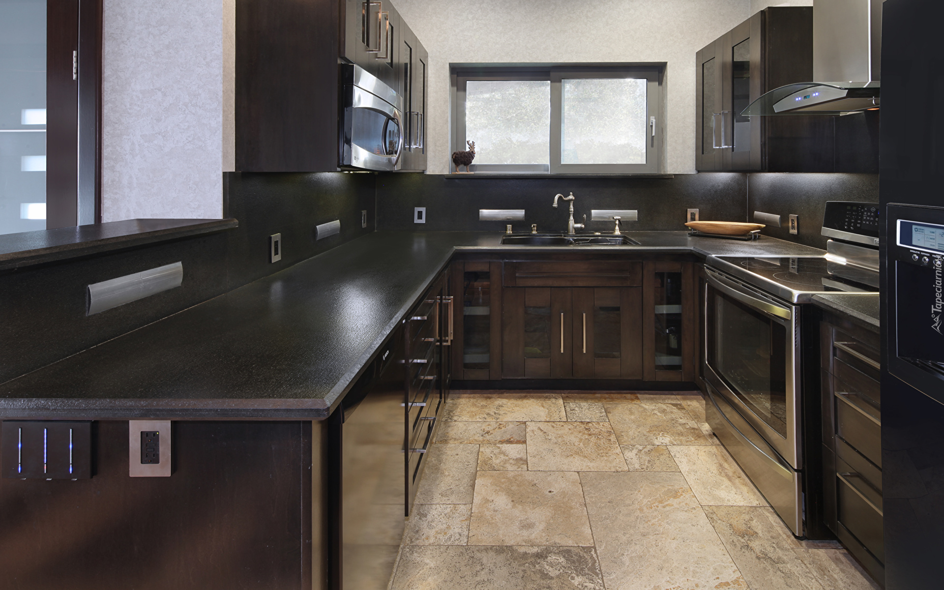 Edytor tapety: Wnętrze kuchni z ciemnymi meblami