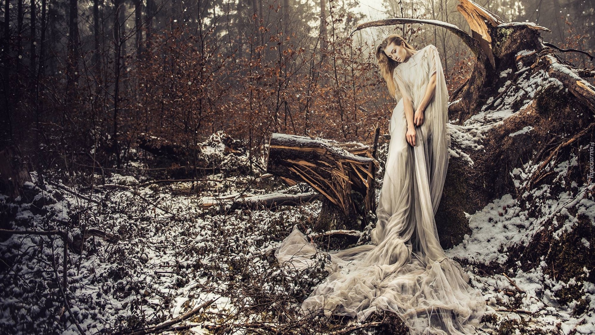 Edytor tapety: Kobieta w długiej sukni przy zwalonym pniu