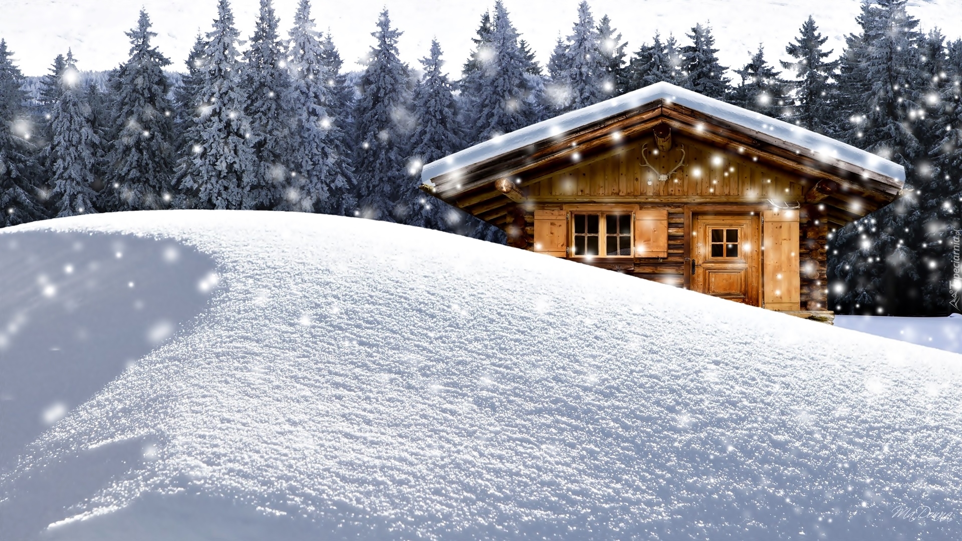 Edytor tapety: Drewniany domek pod lasem zimą