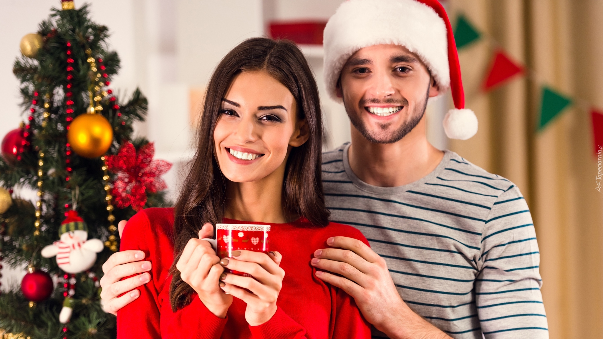 Edytor tapety: Uśmiechnięci kobieta i mężczyzna przy choince