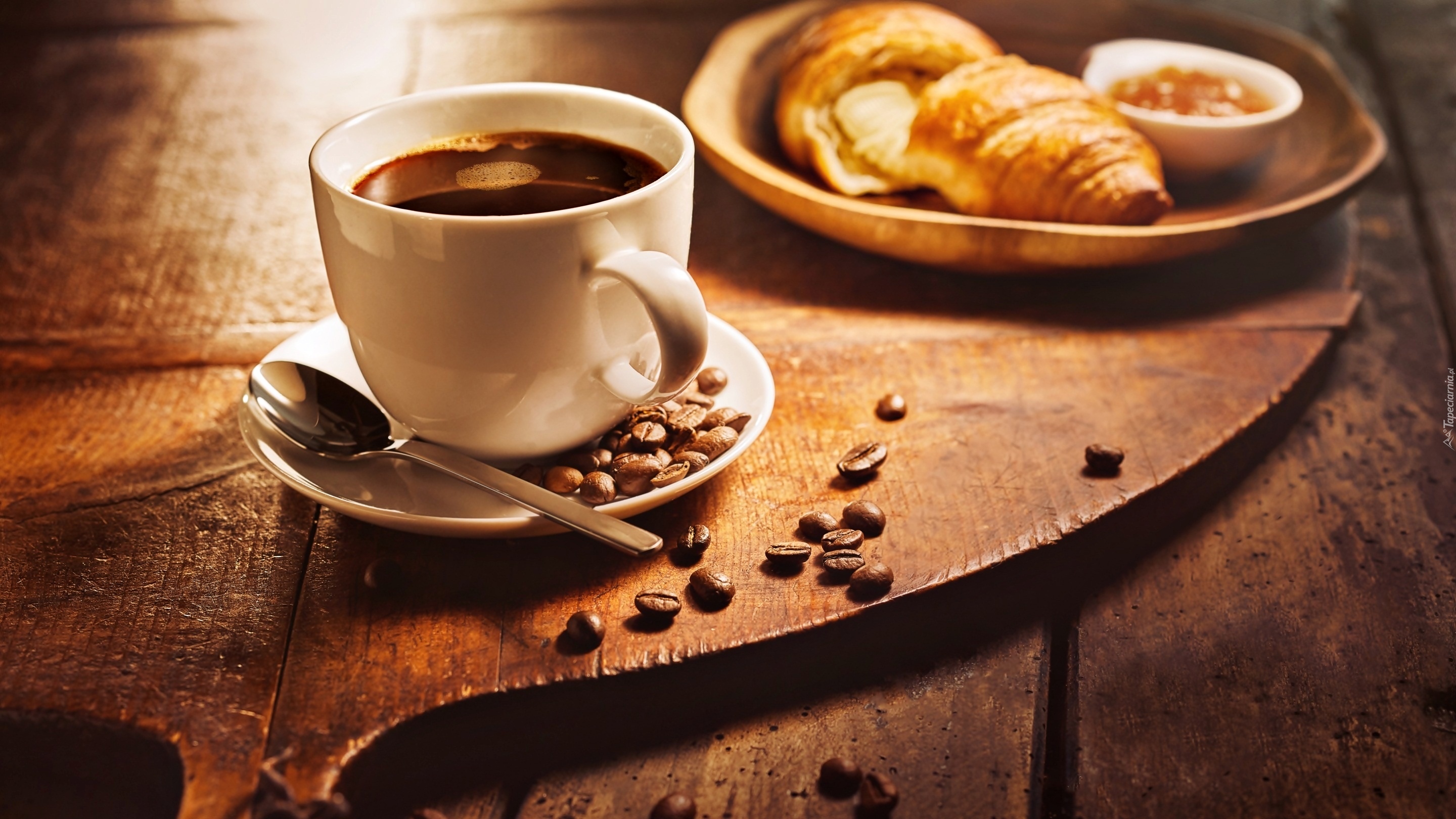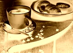 Edytor tapety: Kawa w filiżance i rogalik na talerzyku