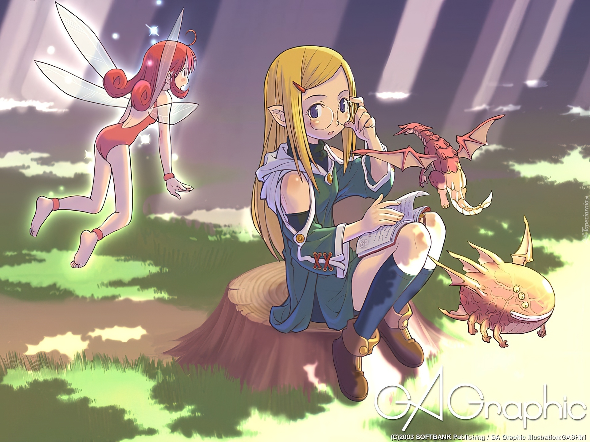 Edytor tapety: Ga Graphic, smok, dziewczyna, elf, las, pieniek
