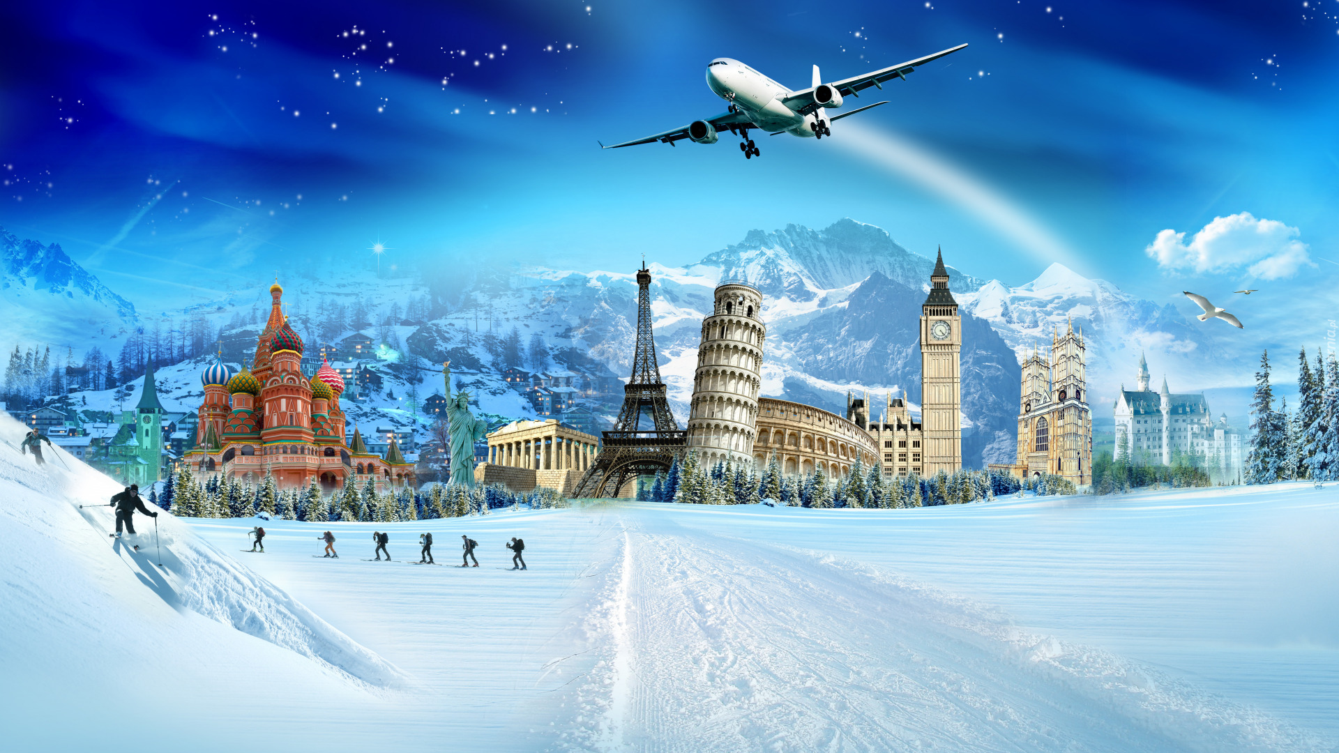 Edytor tapety: Samolot przelatujący nad słynnymi budowlami