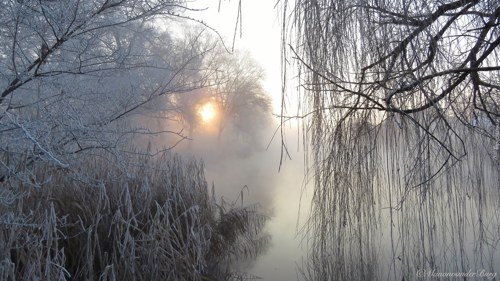 Edytor tapety: Poranek nad zamglonym jeziorem zimową porą