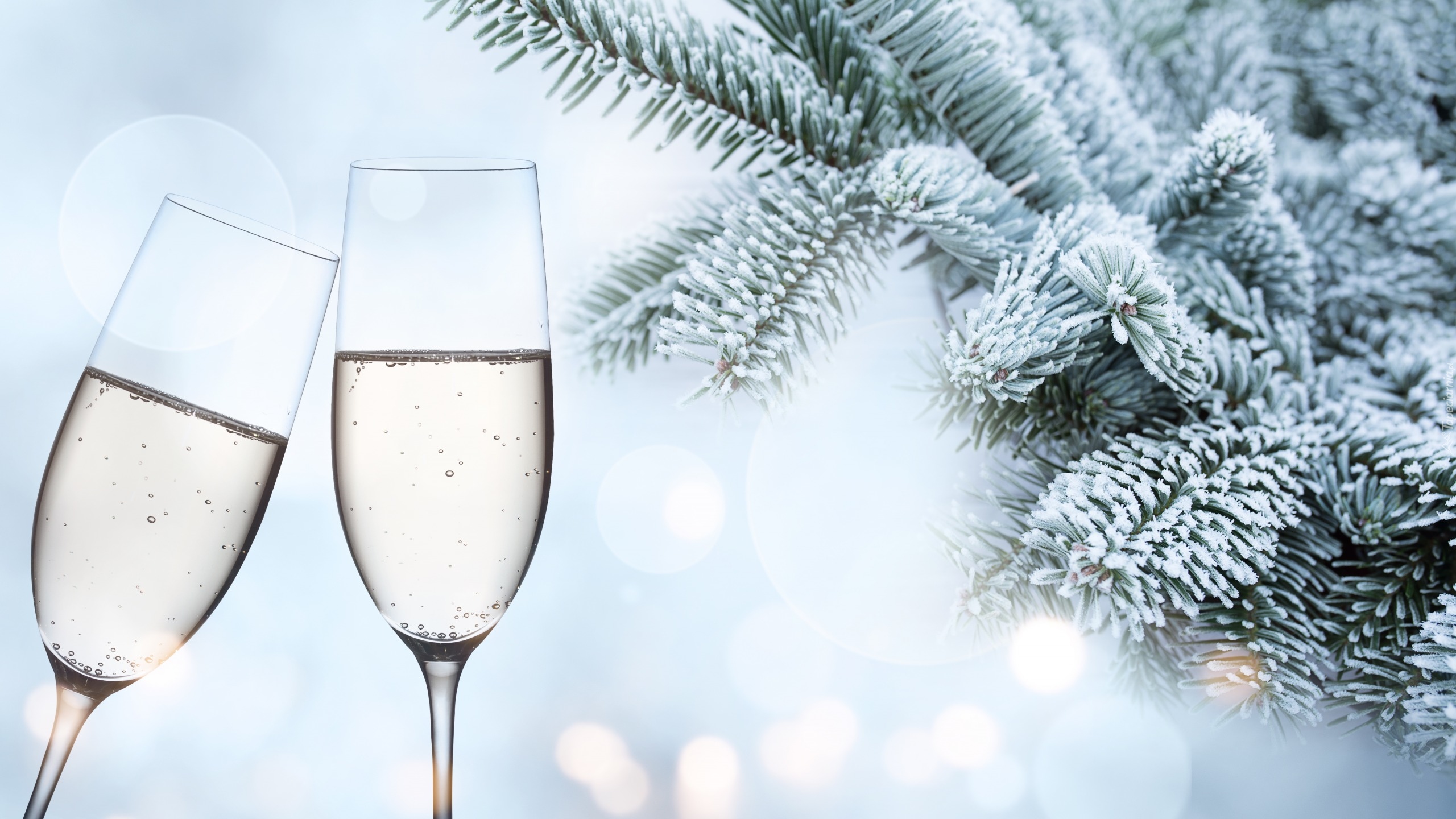 Edytor tapety: Kieliszki z szampanem obok gałązek świerku