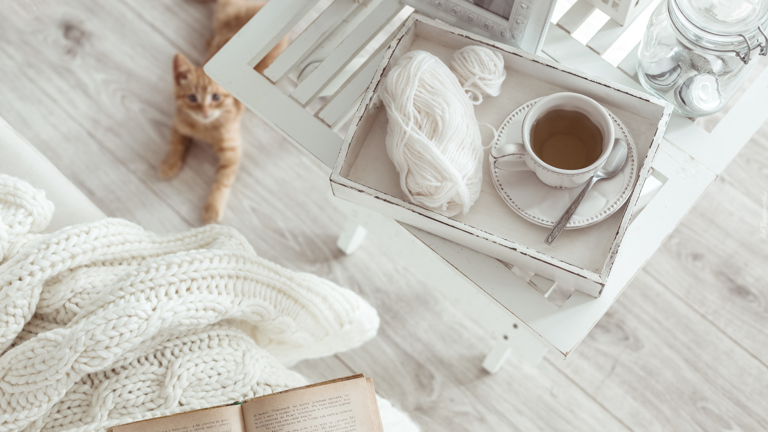 Edytor tapety: Herbata w filiżance na tacy obok motka włóczki