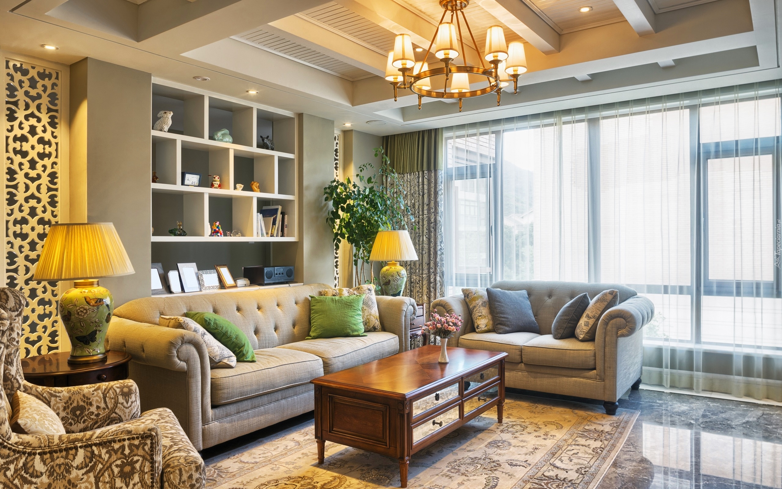 Edytor tapety: Umeblowany pokój z dużymi oknami