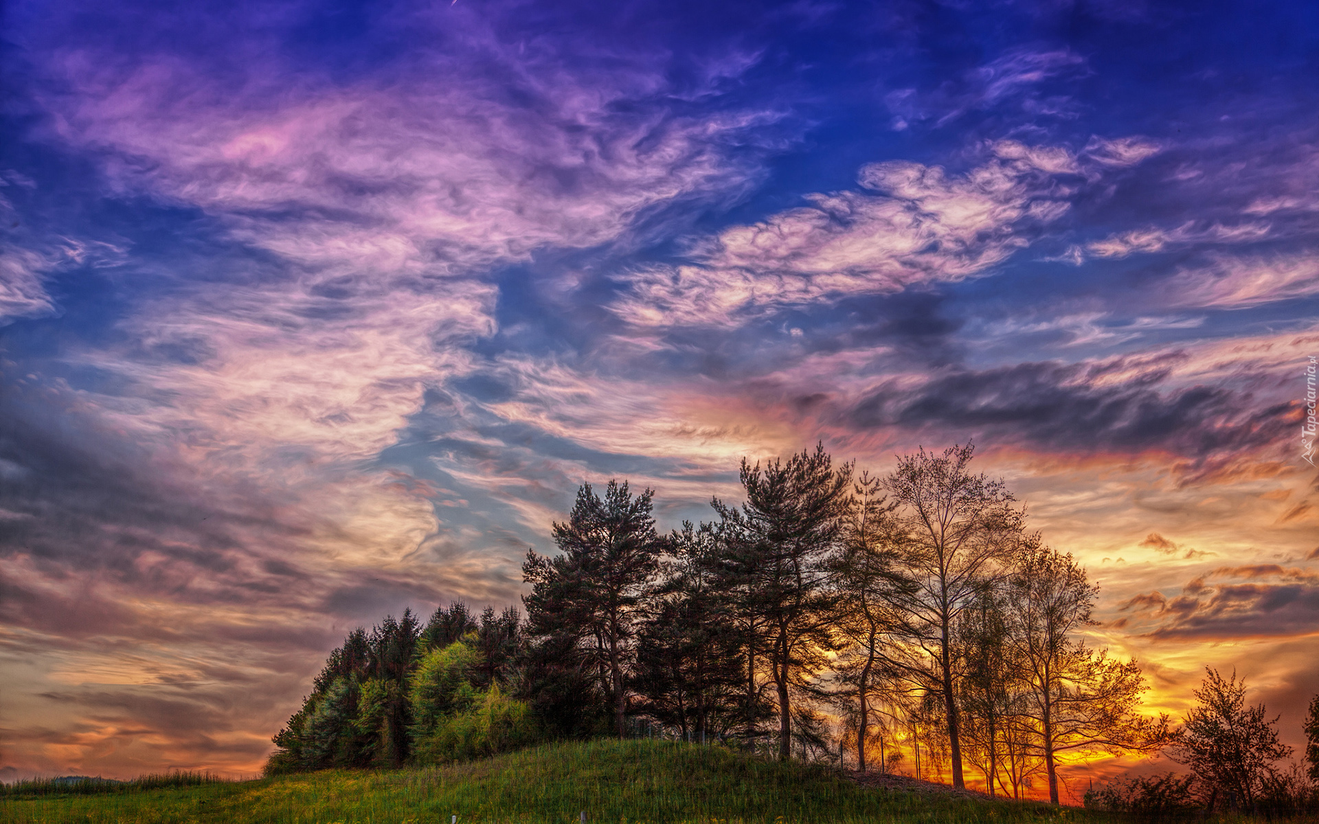Edytor tapety: Drzewa na wzgórzu w blasku zachodzącego słońca