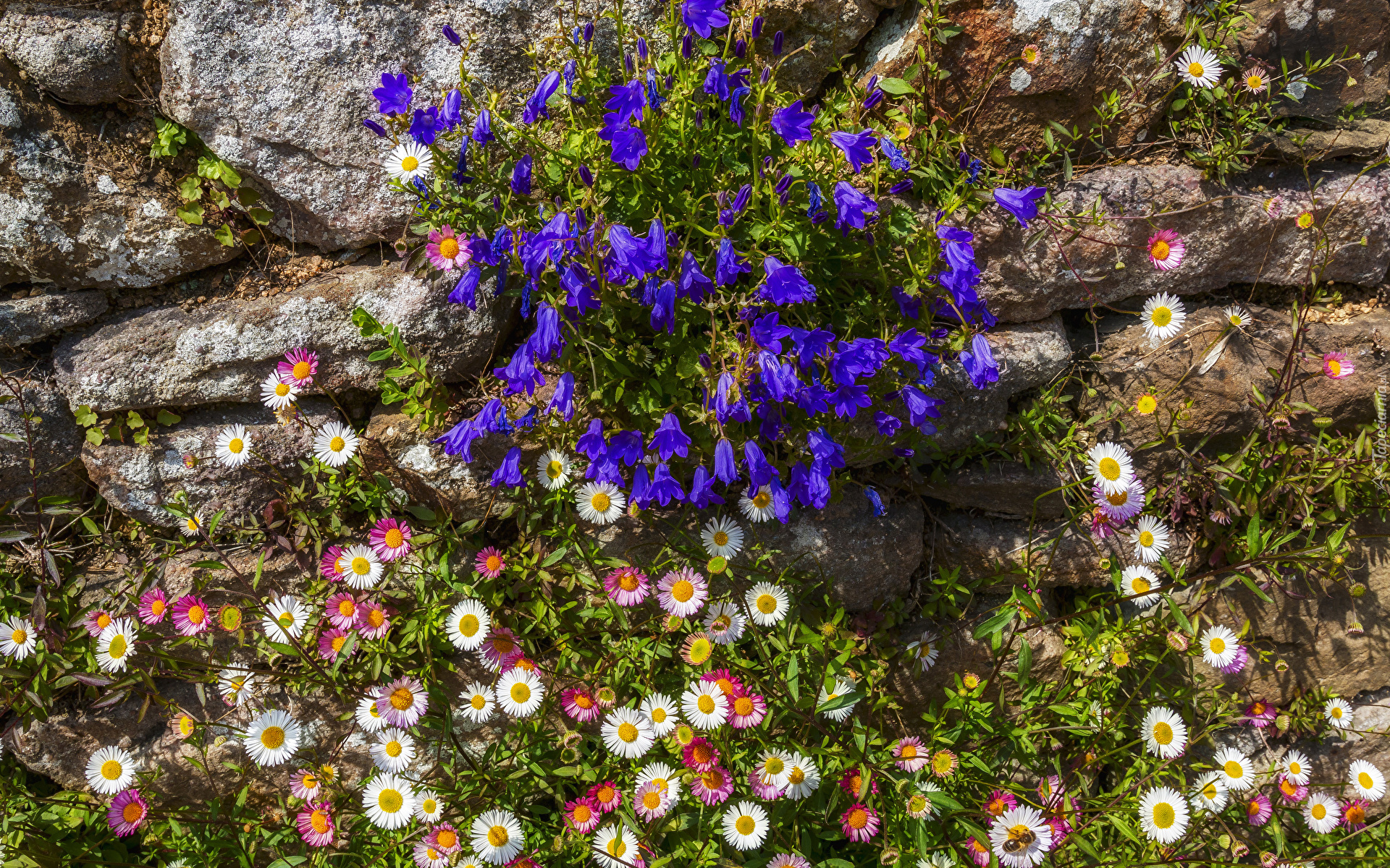 Edytor tapety: Skalniak porośnięty dzwonkami i stokrotkami