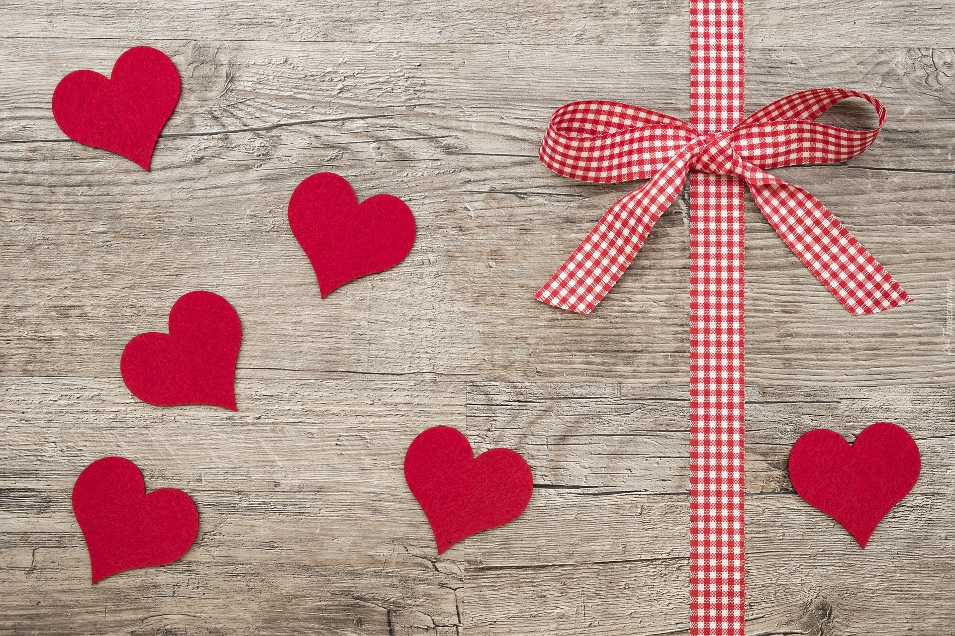 Edytor tapety: Czerwone serduszka i wstążka na deskach