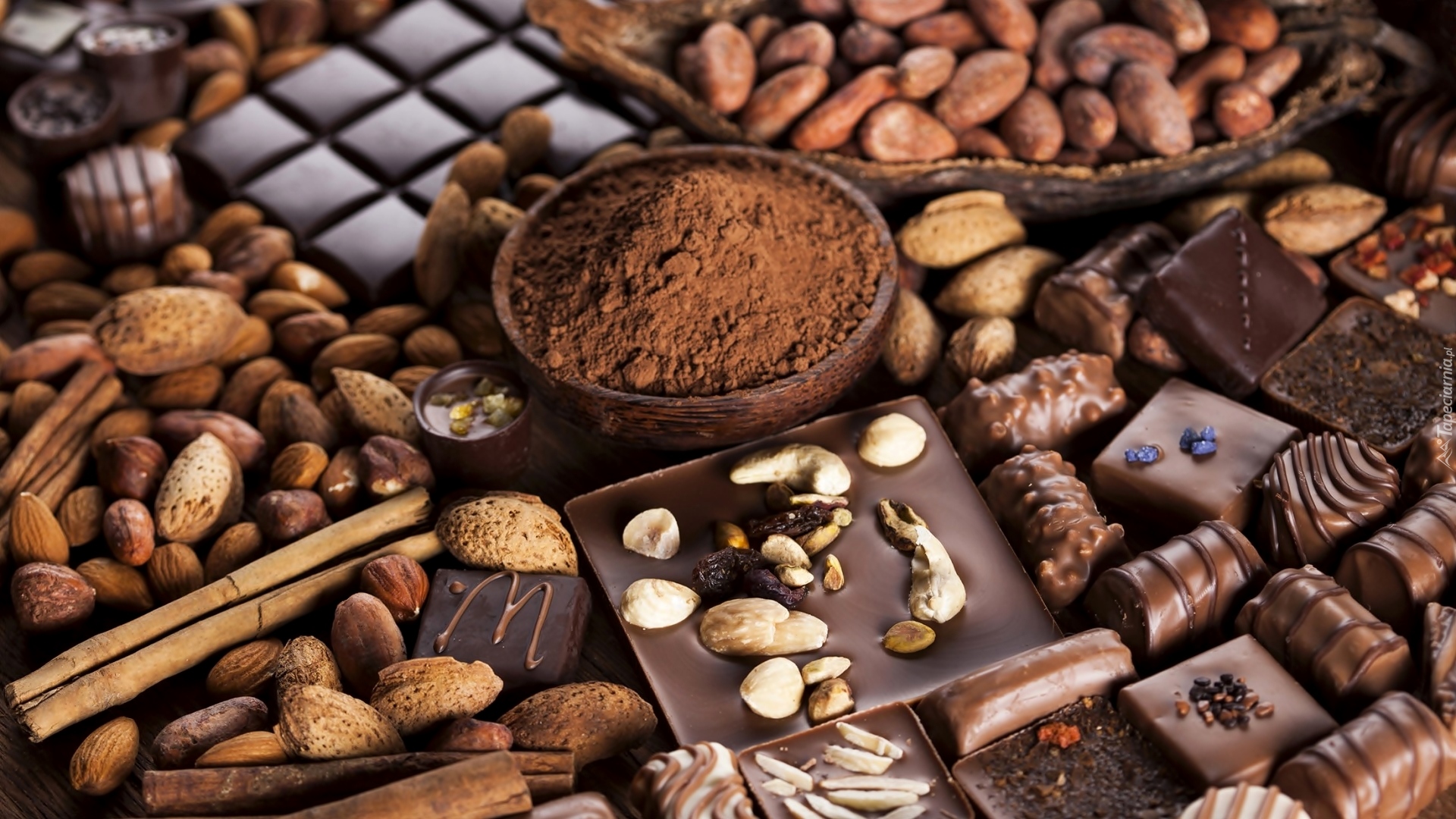 Edytor tapety: Pralinki i bakalie wokół miseczki z kakao