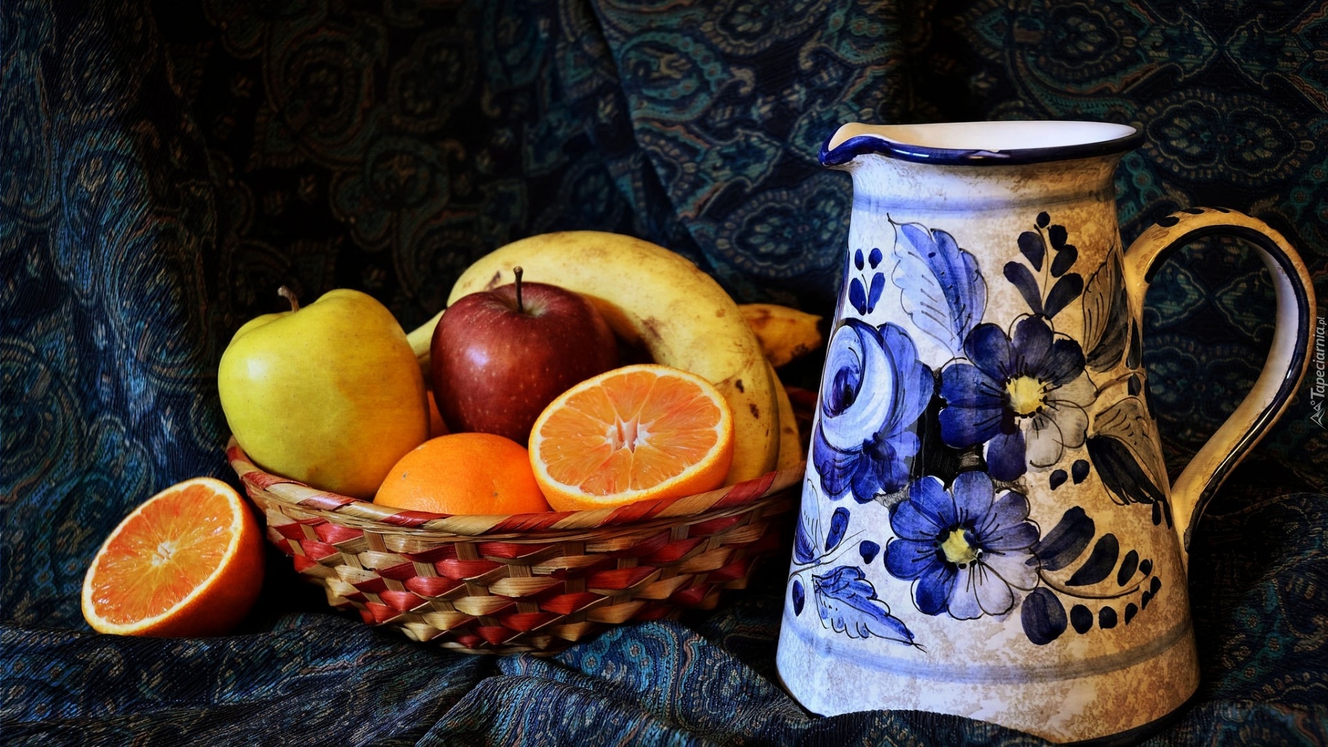 Edytor tapety: Dzbanek obok koszyka z owocami
