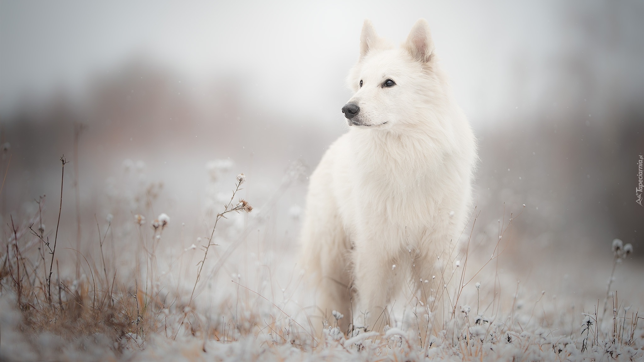 Edytor tapety: Biały owczarek szwajcarski na zaśnieżonej łące