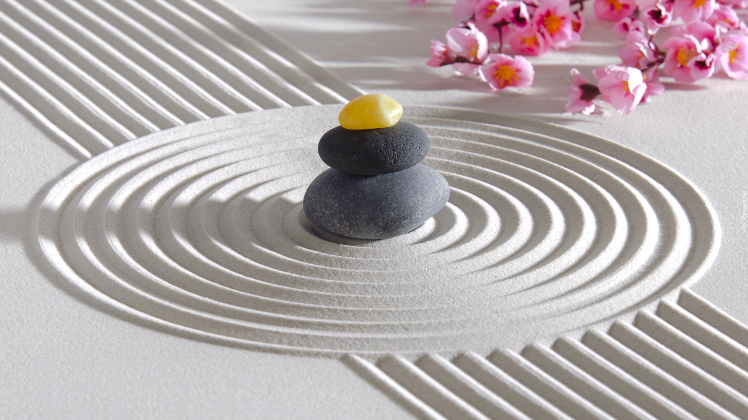 Edytor tapety: Kamienie na piasku z kwiatami w tle