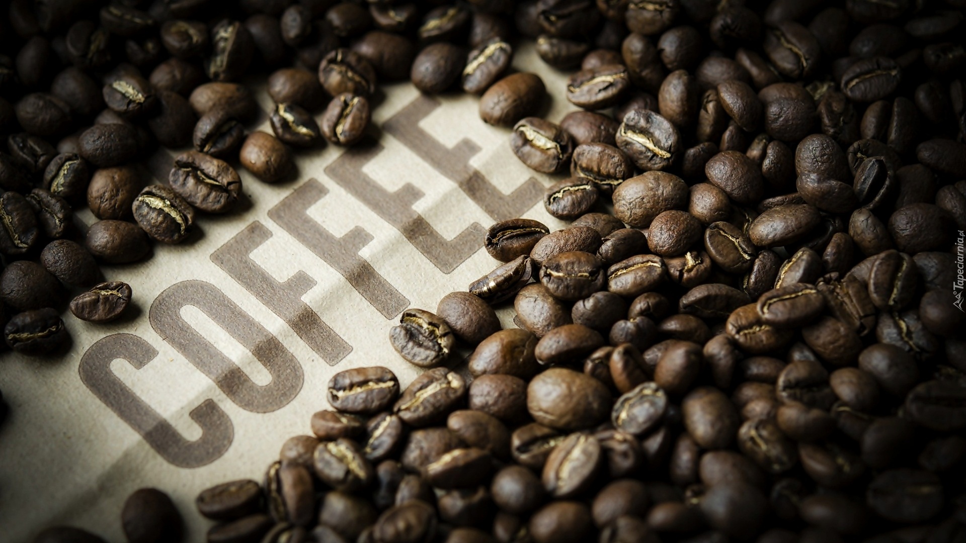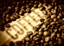 Edytor tapety: Napis coffee pośród rozsypanych ziaren kawy