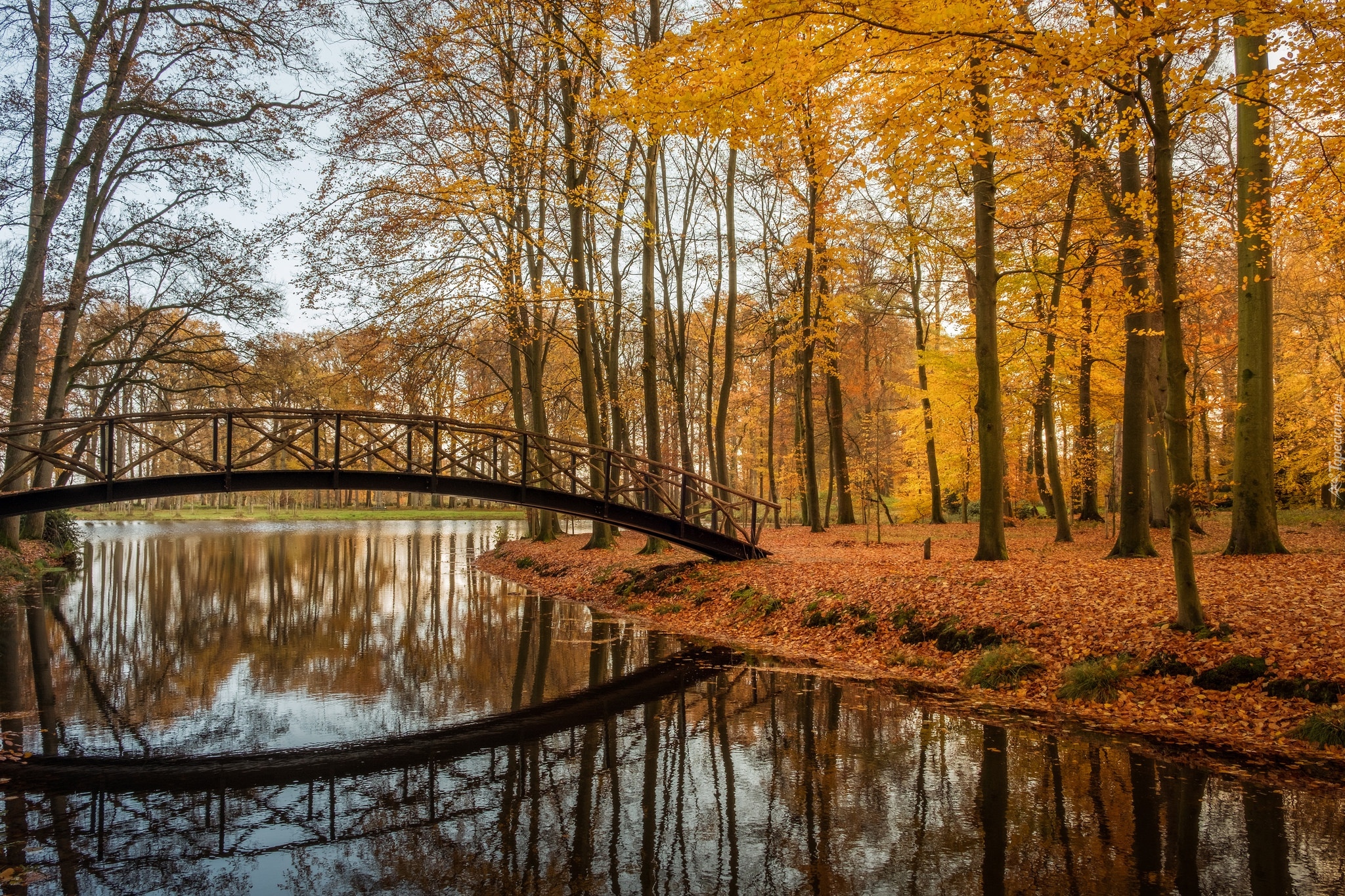 Edytor tapety: Mostek nad stawem w jesiennym parku w Holandii