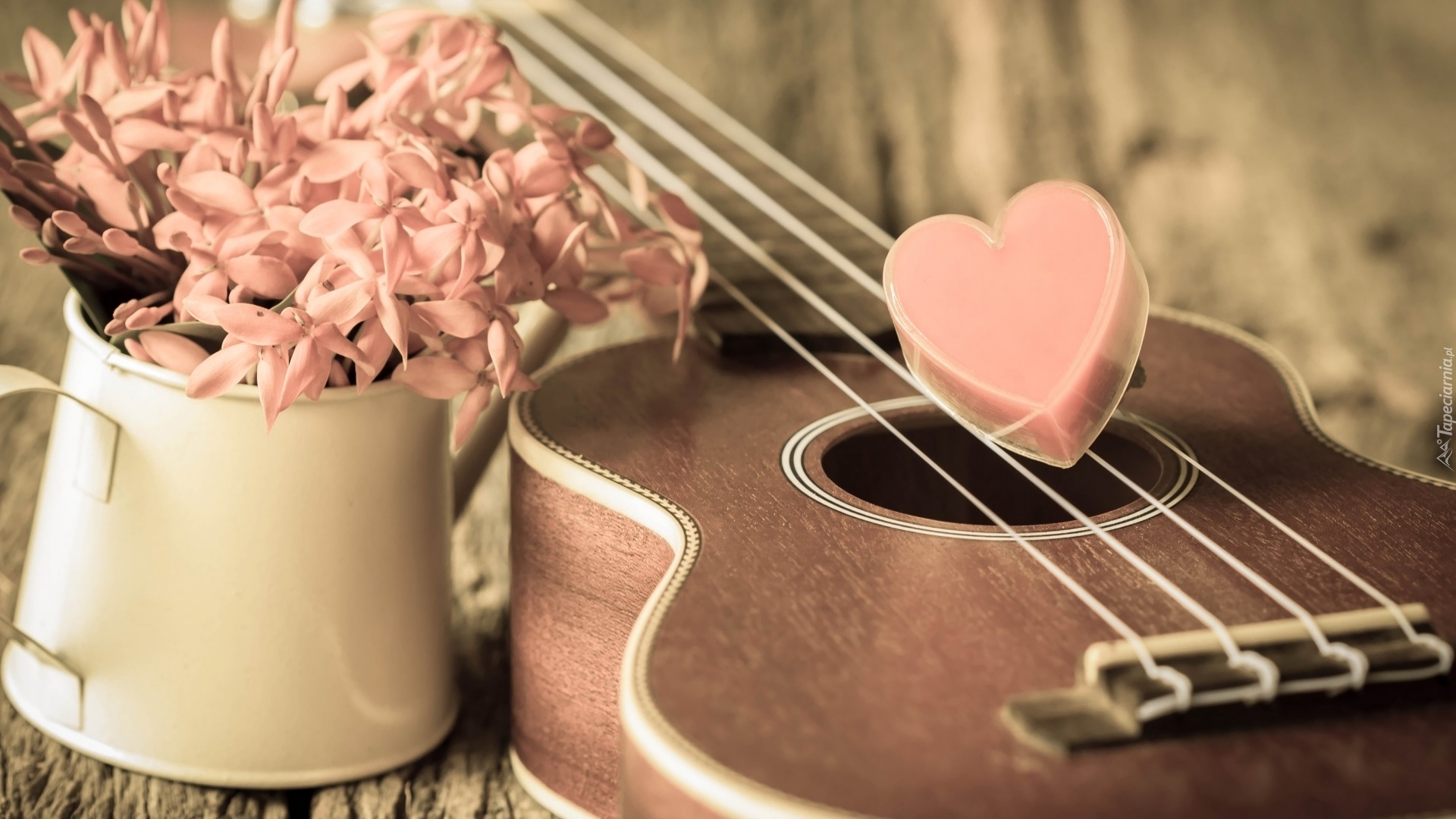 Edytor tapety: Serce na strunach gitary i dzbanek z kwiatami