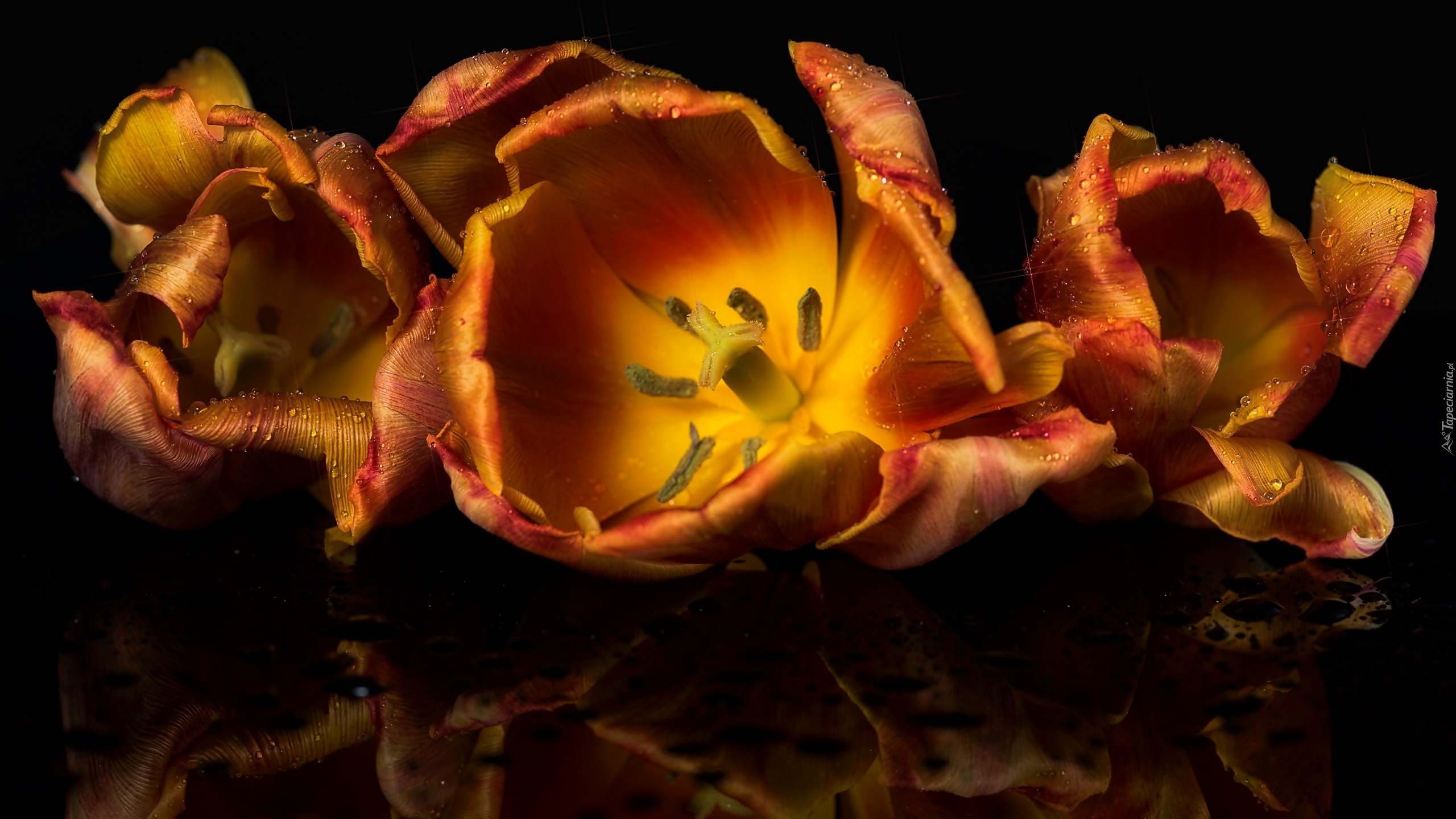 Edytor tapety: Krople wody na pomarańczowych tulipanach