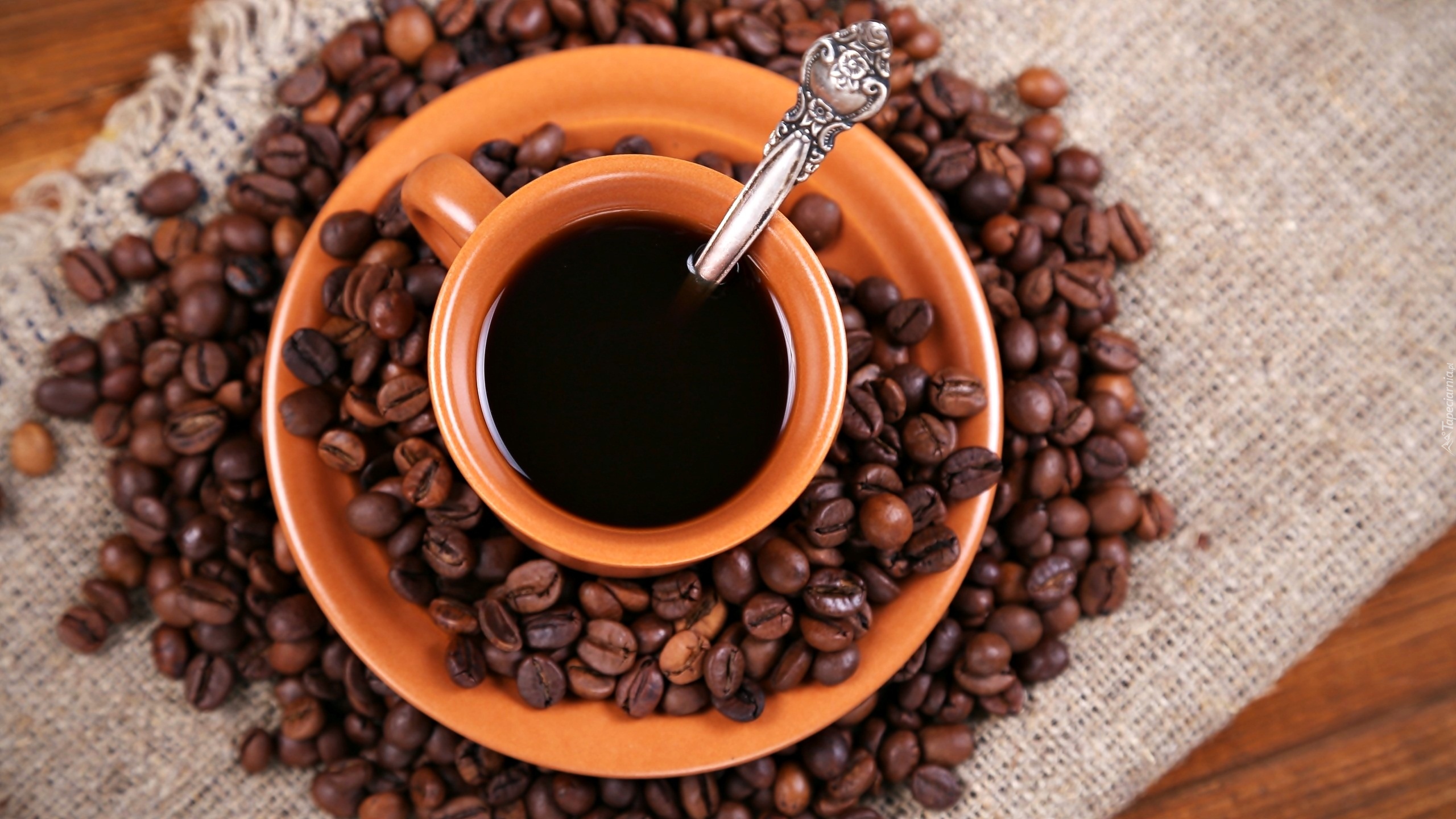 Edytor tapety: Filiżanka kawy i ziarna na serwetce