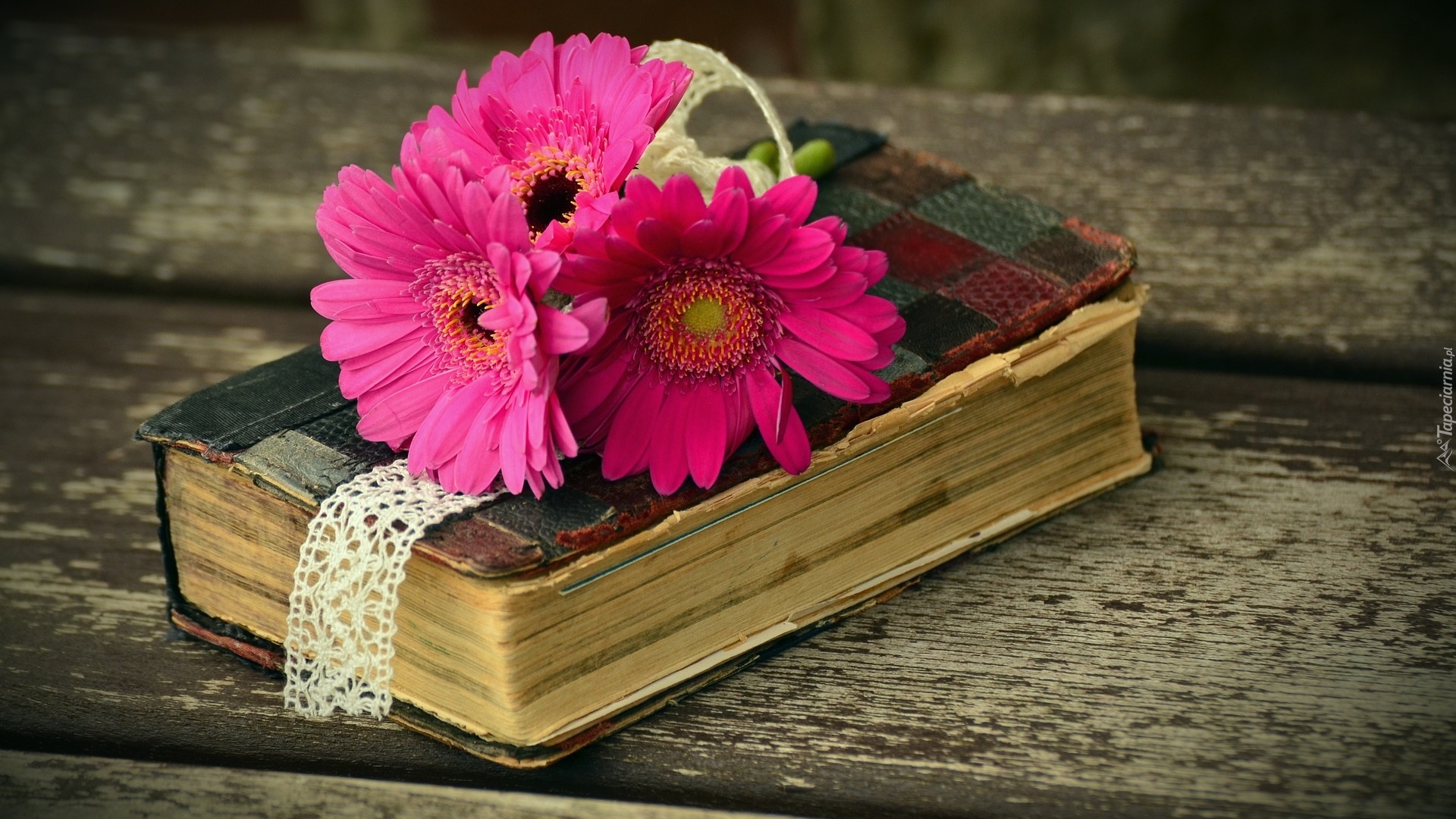 Edytor tapety: Różowe gerbery na książce