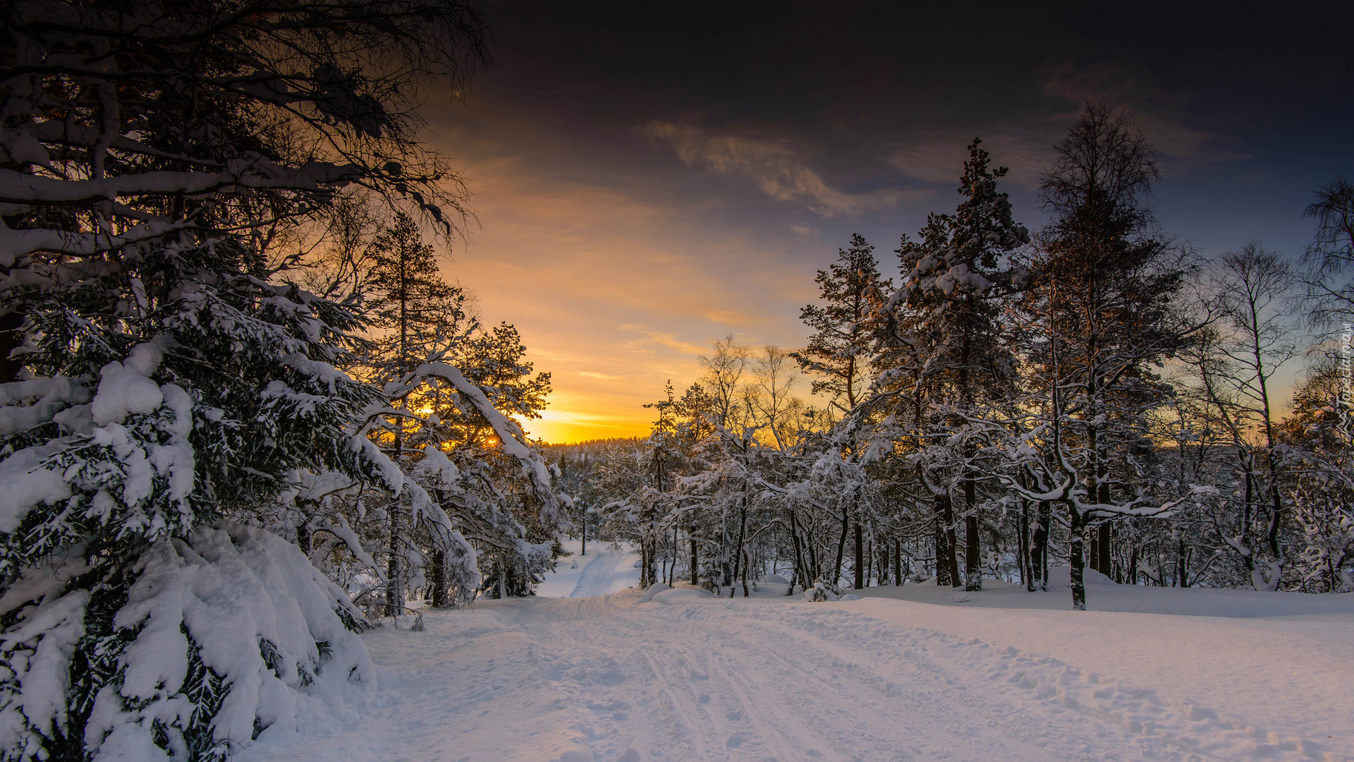 Edytor tapety: Zachód słońca w zimowym lesie