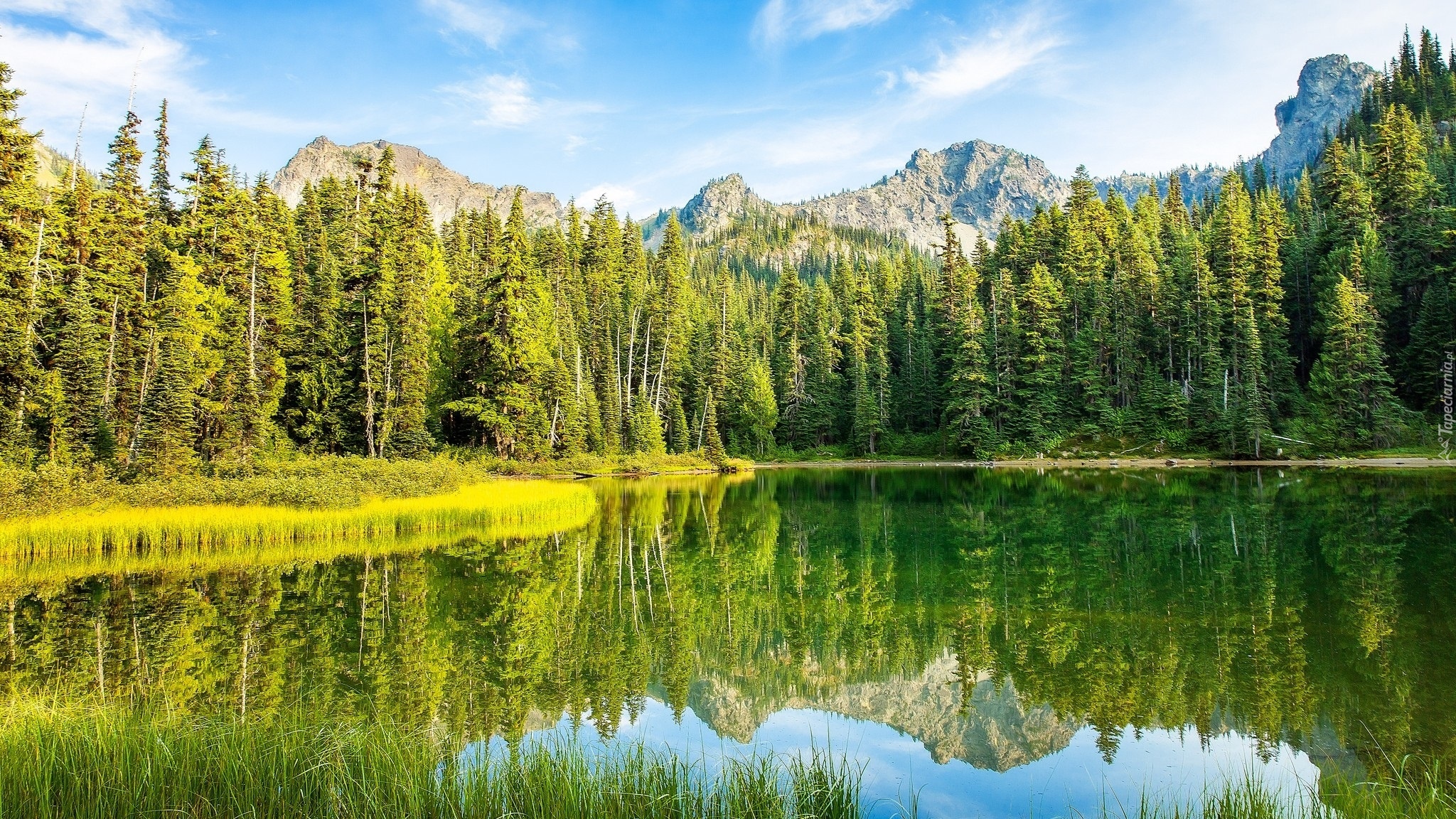 Edytor tapety: Odbicie zielonych drzew i szczytów gór w jeziorze